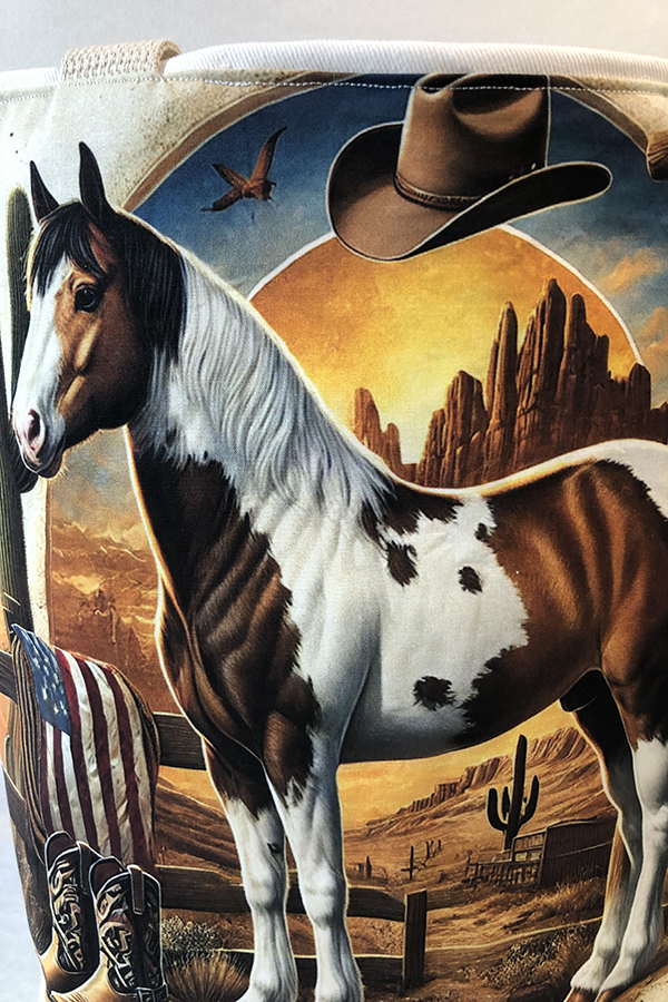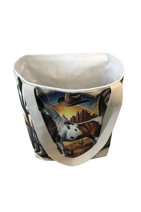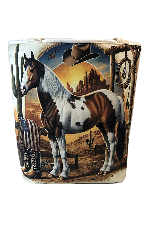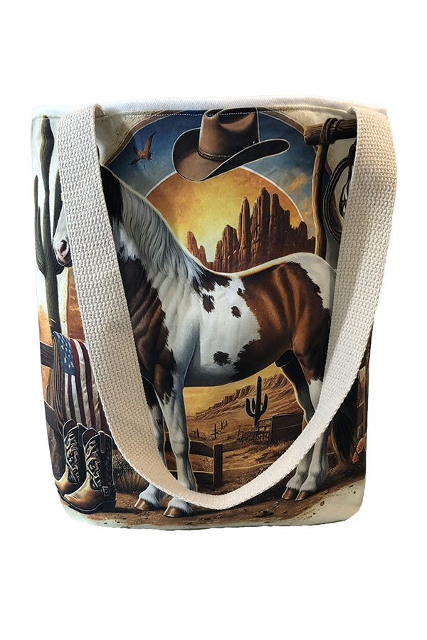 Introducing the epitome of equine elegance and artisan craftsmanship: the Handmade Designer American Paint Brown/Heritage Tote Bag. Standing proud at 14 inches tall and stretching 16 inches wide, this exquisite accessory is a tribute to functionality and style. Crafted with meticulous attention to detail, it will become your wardrobe’s darling. At first glance, your eyes are immediately drawn to the captivating design gracing the tote’s exterior. Adorning the durable fabric are elegant horse graphics, each infused with personality and charm. Their stately demeanor brings a touch of whimsy to the bag, making it a conversation starter wherever you go.