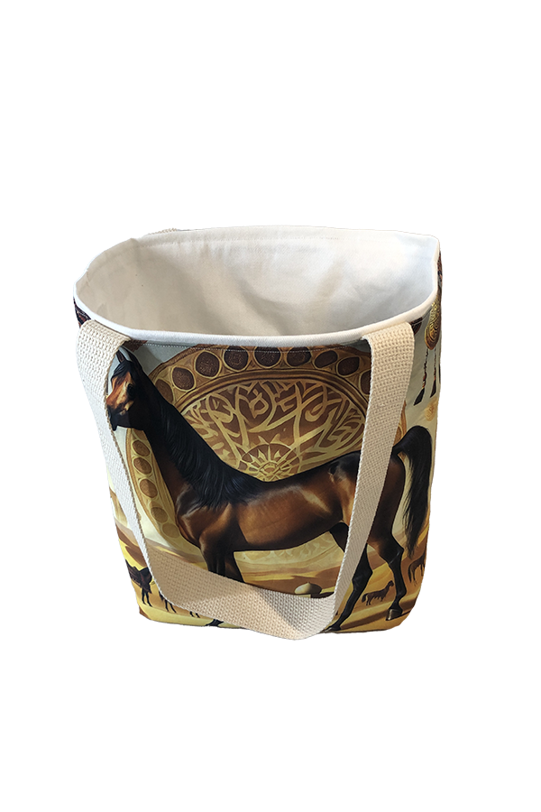 Introducing the epitome of equine elegance and artisan craftsmanship: the Handmade Designer Arabian Bay Heritage Tote Bag. Standing proud at 14 inches tall and stretching 16 inches wide, this exquisite accessory is a tribute to functionality and style. Crafted with meticulous attention to detail, it will become your wardrobe’s darling. At first glance, your eyes are immediately drawn to the captivating design gracing the tote’s exterior. Adorning the durable fabric are elegant horse graphics, each infused with personality and charm. Their stately demeanor brings a touch of whimsy to the bag, making it a conversation starter wherever you go.