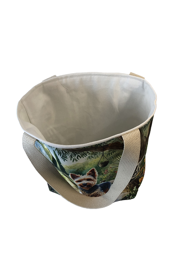Introducing the epitome of canine elegance and artisan craftsmanship: the Handmade Designer Australian Terrier Garden Tote Bag. Standing proudly at 14 inches tall and stretching 16 inches wide, this exquisite accessory is a testament to both functionality and style. Crafted with meticulous attention to detail, it will become your wardrobe’s darling. At first glance, your eyes are immediately drawn to the captivating design gracing the tote’s exterior. Your pet is displayed in a beautiful scene on a durable fabric. The playful demeanor brings a touch of whimsy to the bag, making it a conversation starter wherever you go.