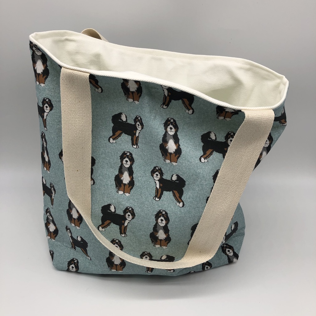 Introducing the epitome of canine elegance and artisan craftsmanship: the Handmade Designer Bernedoodle #10 Tote Bag. Standing proud at 14 inches tall and stretching 16 inches wide, this exquisite accessory is a tribute to both functionality and style. Crafted with meticulous attention to detail, it is destined to become the darling of your wardrobe. At first glance, your eyes are immediately drawn to the captivating design gracing the exterior of the tote. Adorning the durable fabric are charming dogs, each one infused with personality and charm. Their playful demeanor brings a touch of whimsy to the bag, making it a conversation starter wherever you go. But beauty is not merely skin-deep. This Handmade Designer Bernedoodle #10 Tote Bag boasts functionality as impressive as its aesthetics. The exterior fabric, carefully chosen for its durability and resilience, ensures that your belongings remain secure and protected during your travels. Meanwhile, the spacious interior, lined with 100 percent cotton white twill, provides a soft and luxurious sanctuary for your essentials.