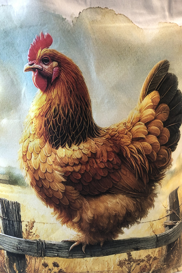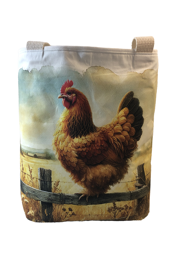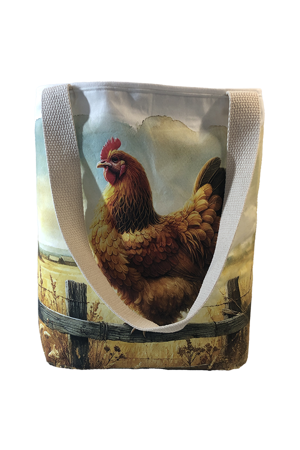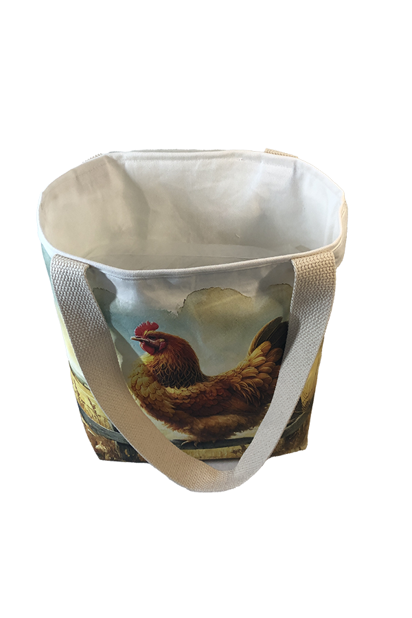 Crafted meticulously, this Handmade Designer Brahma Buff Fence tote bag showcases a picture of a majestic show chicken, capturing its elegance and vibrant plumage in stunning detail. The design is printed on an all-cotton outer layer, which is durable and lends a soft, luxurious feel to the bag. The outer fabric is carefully selected to ensure the striking image remains vibrant and eye-catching, making the tote a conversation starter wherever you go.
