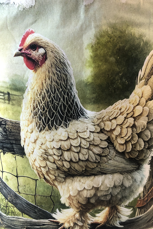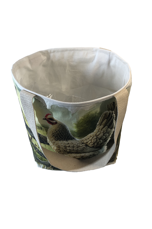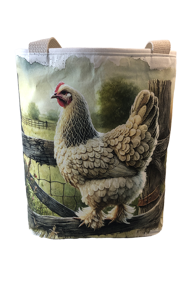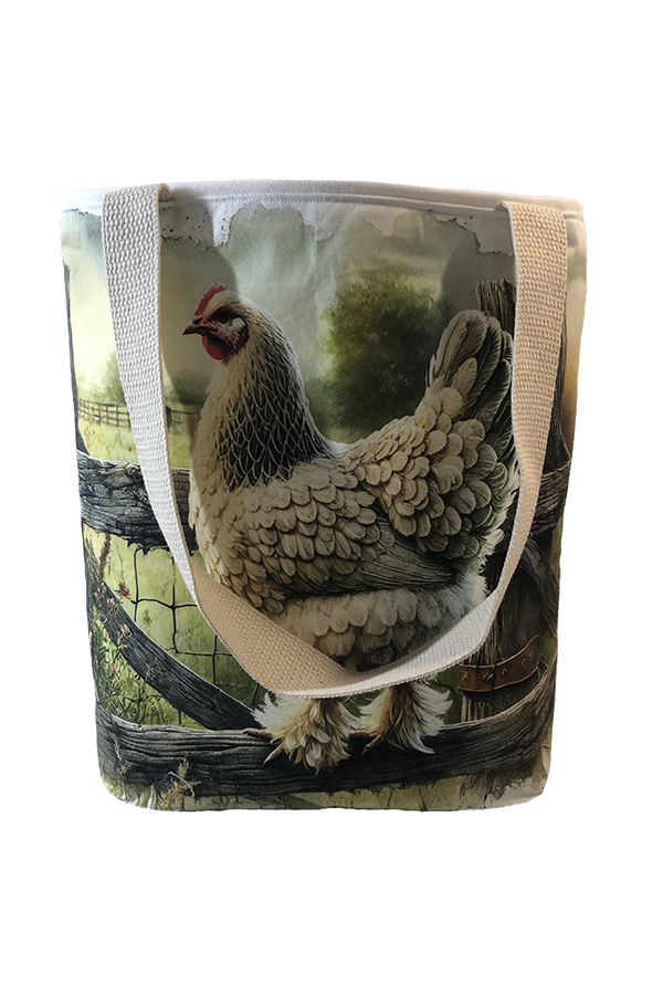 Crafted meticulously, this Handmade Designer Brahma Light Fence tote bag showcases a picture of a majestic show chicken, capturing its elegance and vibrant plumage in stunning detail. The design is printed on an all-cotton outer layer, which is durable and lends a soft, luxurious feel to the bag. The outer fabric is carefully selected to ensure the striking image remains vibrant and eye-catching, making the tote a conversation starter wherever you go.
