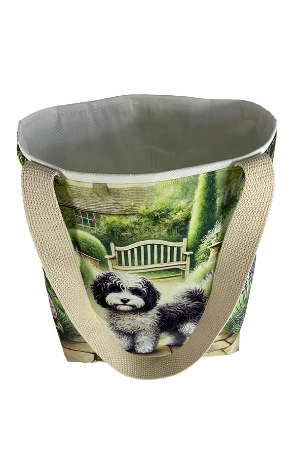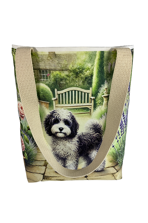 Introducing the epitome of canine elegance and artisan craftsmanship: the Handmade Designer Cavapoo Black/White Garden Tote Bag. Standing proud at 14 inches tall and stretching 16 inches wide, this exquisite accessory is a tribute to functionality and style. Crafted with meticulous attention to detail, it will become your wardrobe’s darling. At first glance, your eyes are immediately drawn to the captivating design gracing the tote’s exterior. Your pet is displayed in a beautiful scene with personality and charm. Their playful demeanor brings a touch of whimsy to the bag, making it a conversation starter wherever you go.