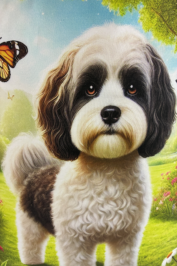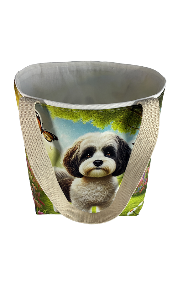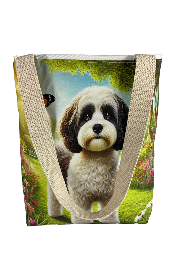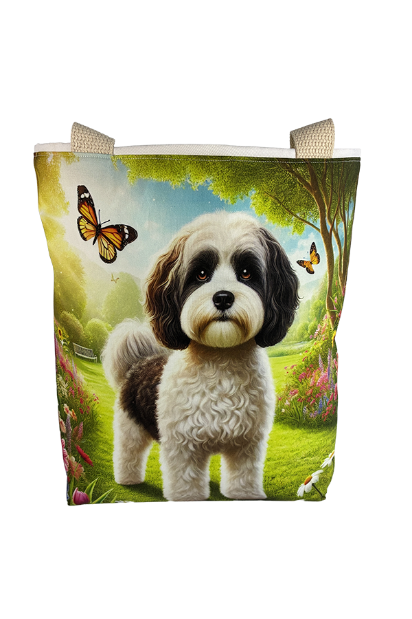 Introducing the epitome of canine elegance and artisan craftsmanship: the Handmade Designer Cavapoo Black/White Park Tote Bag. Standing proud at 14 inches tall and stretching 16 inches wide, this exquisite accessory is a tribute to functionality and style. Crafted with meticulous attention to detail, it will become your wardrobe’s darling. At first glance, your eyes are immediately drawn to the captivating design gracing the tote’s exterior. Your pet is displayed in a beautiful scene with personality and charm. Their playful demeanor brings a touch of whimsy to the bag, making it a conversation starter wherever you go.