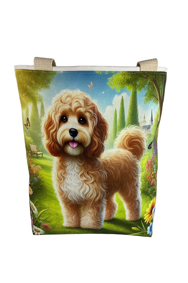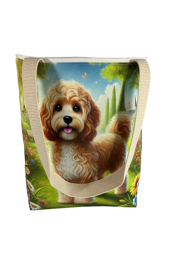 Introducing the epitome of canine elegance and artisan craftsmanship: the Handmade Designer Cavapoo Tan/White Park Tote Bag. Standing proud at 14 inches tall and stretching 16 inches wide, this exquisite accessory is a tribute to functionality and style. Crafted with meticulous attention to detail, it will become your wardrobe’s darling. At first glance, your eyes are immediately drawn to the captivating design gracing the tote’s exterior. Your pet is displayed in a beautiful scene with personality and charm. Their playful demeanor brings a touch of whimsy to the bag, making it a conversation starter wherever you go.