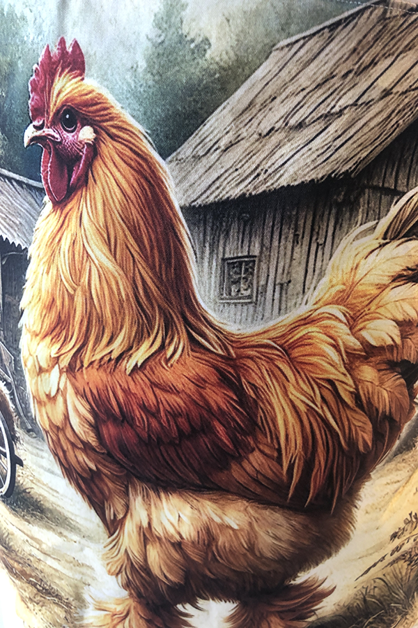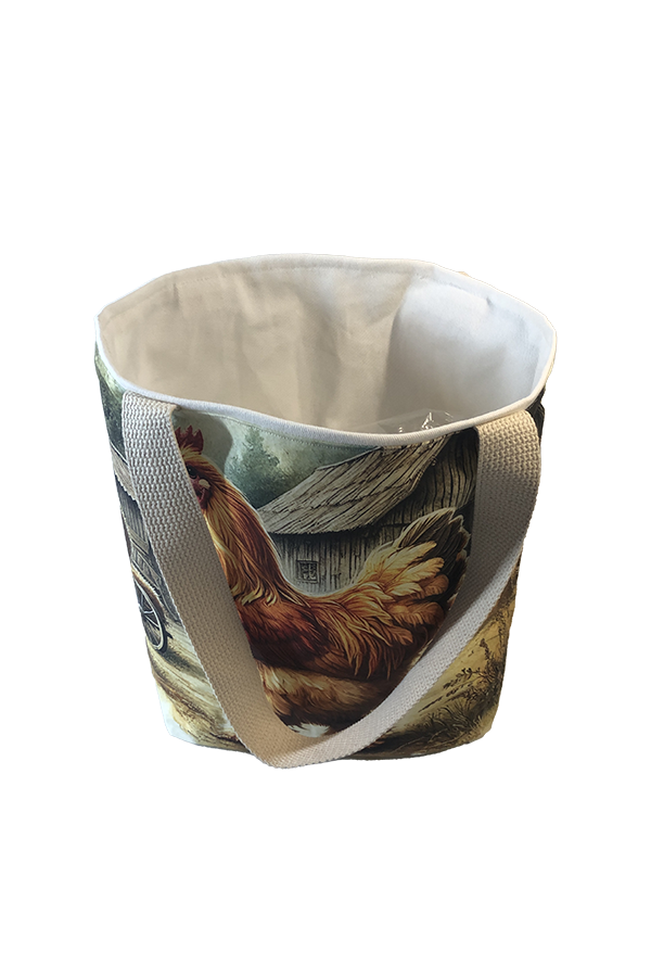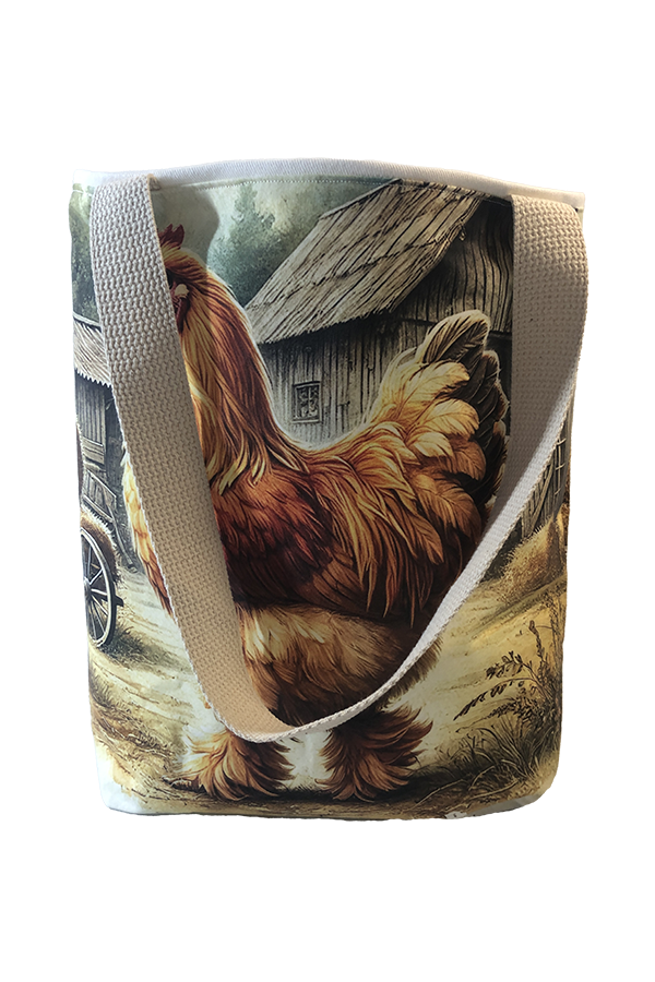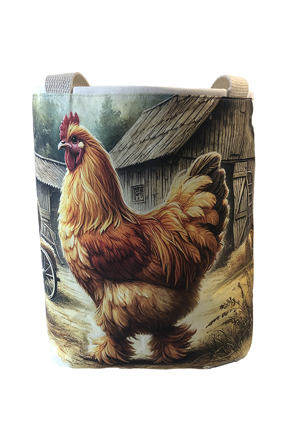 Crafted meticulously, this Handmade Designer Cochin Buff Farm tote bag showcases a picture of a majestic show chicken, capturing its elegance and vibrant plumage in stunning detail. The design is printed on an all-cotton outer layer, which is durable and lends a soft, luxurious feel to the bag. The outer fabric is carefully selected to ensure the striking image remains vibrant and eye-catching, making the tote a conversation starter wherever you go.