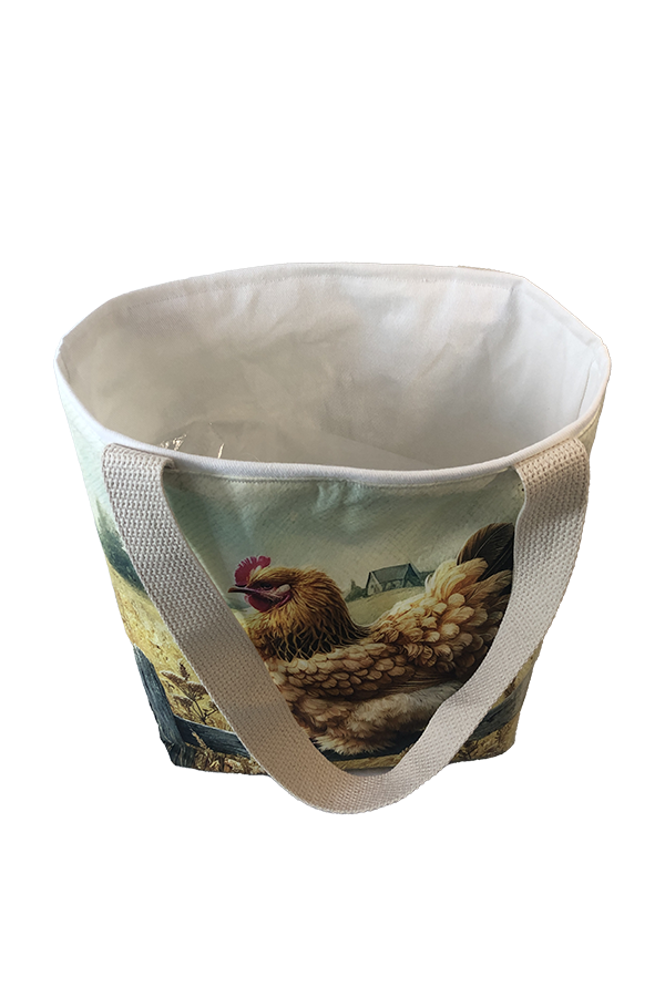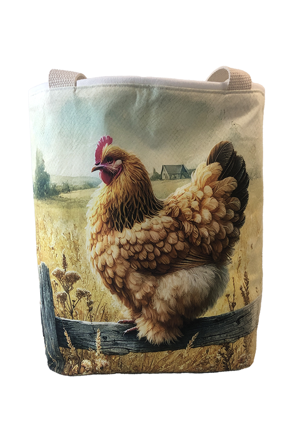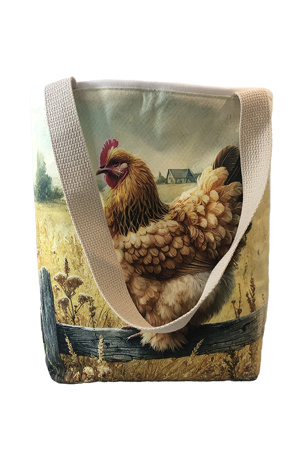 Crafted meticulously, this Handmade Designer Cochin Buff Fence tote bag showcases a picture of a majestic show chicken, capturing its elegance and vibrant plumage in stunning detail. The design is printed on an all-cotton outer layer, which is durable and lends a soft, luxurious feel to the bag. The outer fabric is carefully selected to ensure the striking image remains vibrant and eye-catching, making the tote a conversation starter wherever you go.
