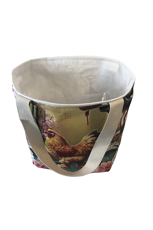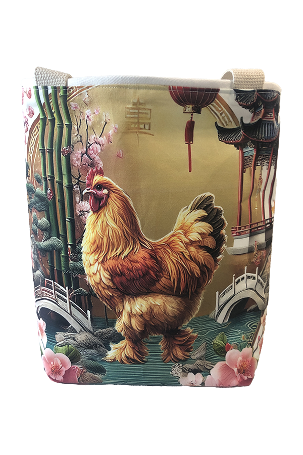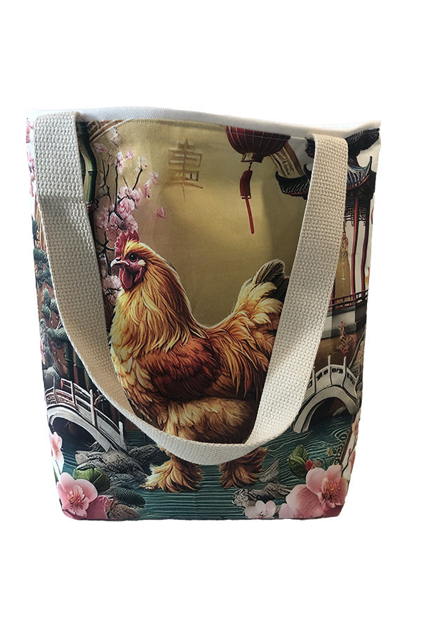 Crafted meticulously, this Handmade Designer Cochin Buff Heritage tote bag showcases a picture of a majestic show chicken, capturing its elegance and vibrant plumage in stunning detail. The design is printed on an all-cotton outer layer, which is durable and lends a soft, luxurious feel to the bag. The outer fabric is carefully selected to ensure the striking image remains vibrant and eye-catching, making the tote a conversation starter wherever you go.