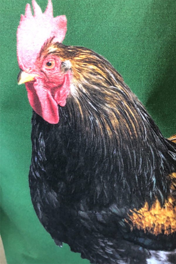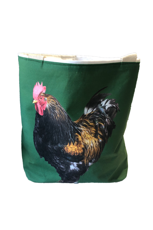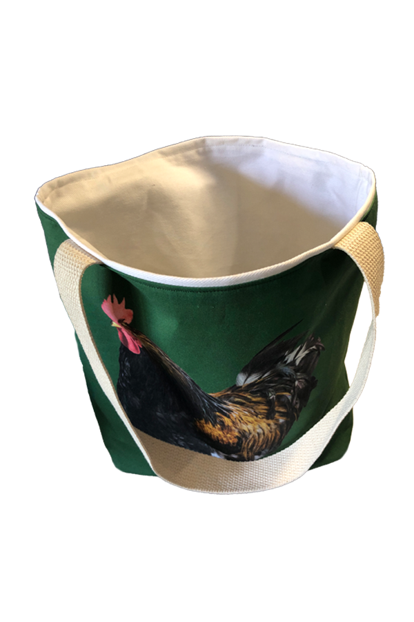 Crafted meticulously, this handmade designer Cochin #3 Green tote bag showcases a picture of a majestic show chicken, capturing its elegance and vibrant plumage in stunning detail. The design is printed on an all-cotton outer layer, which is durable and lends a soft, luxurious feel to the bag. The outer fabric is carefully selected to ensure the striking image remains vibrant and eye-catching, making the tote a conversation starter wherever you go.