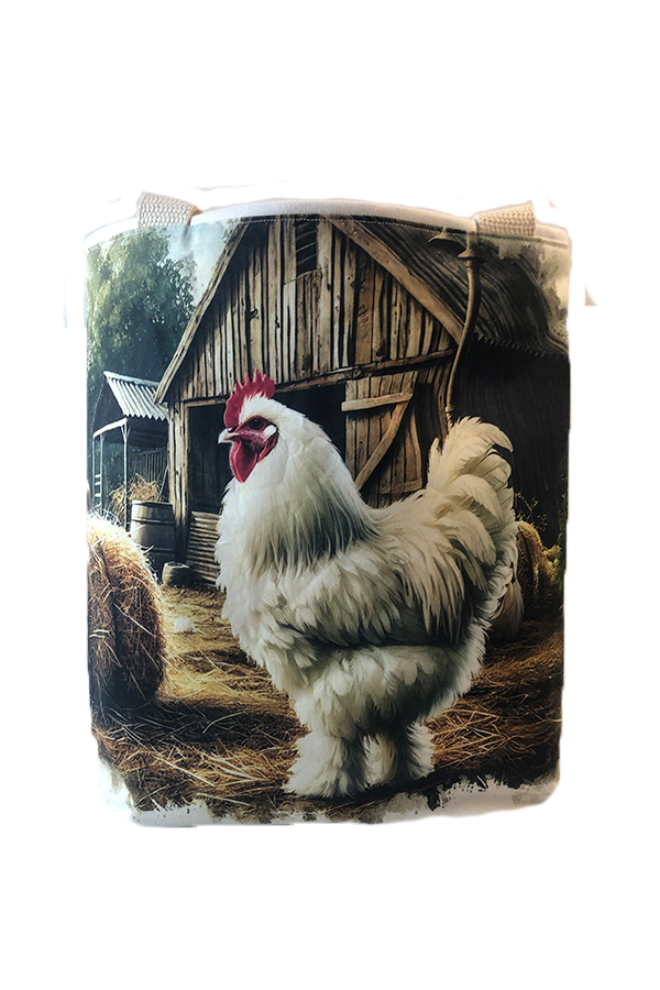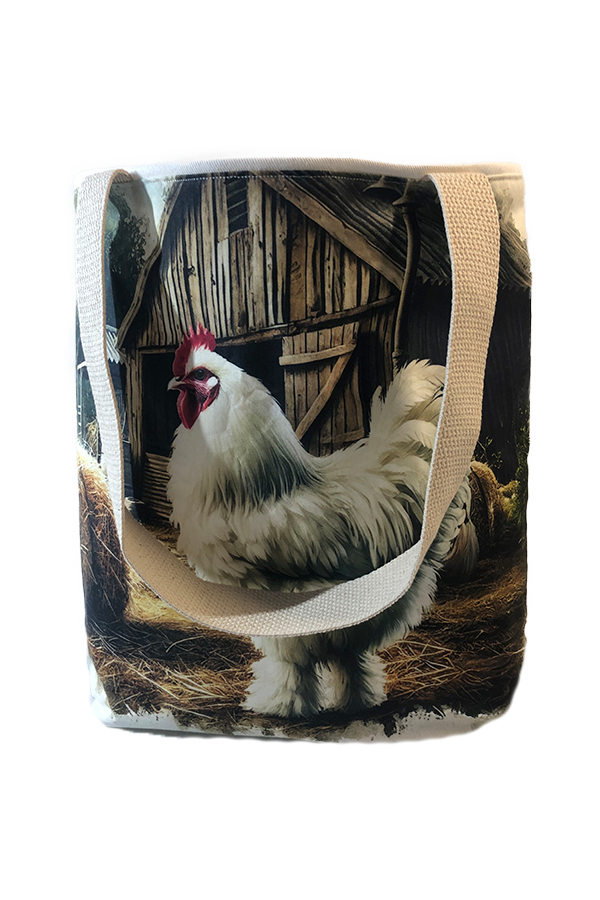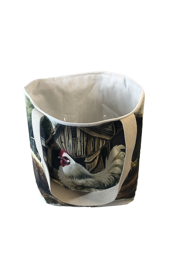 Crafted meticulously, this Handmade Designer Cochin White Farm tote bag showcases a picture of a majestic show chicken, capturing its elegance and vibrant plumage in stunning detail. The design is printed on an all-cotton outer layer, which is durable and lends a soft, luxurious feel to the bag. The outer fabric is carefully selected to ensure the striking image remains vibrant and eye-catching, making the tote a conversation starter wherever you go.