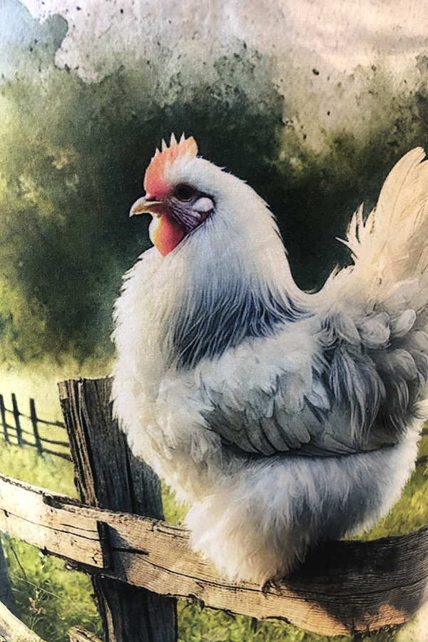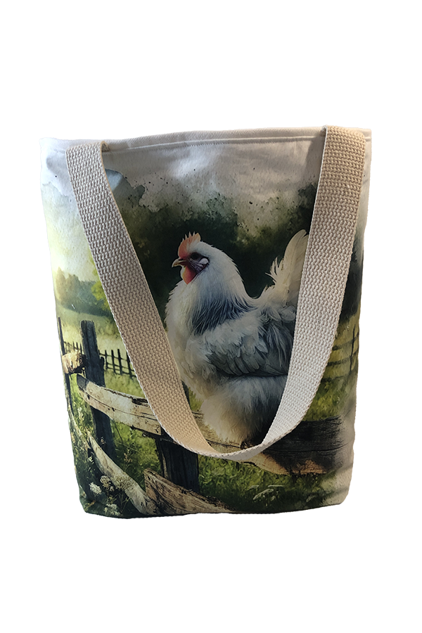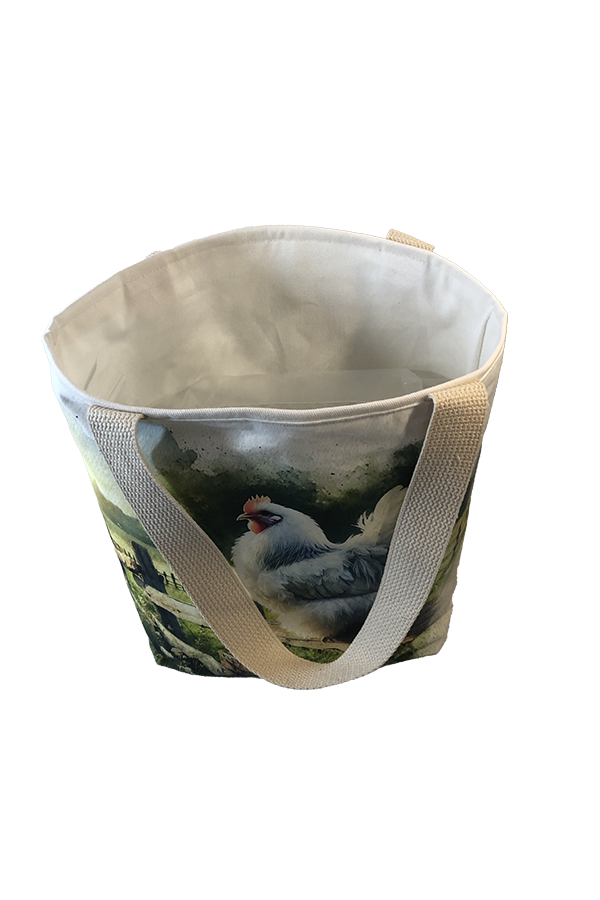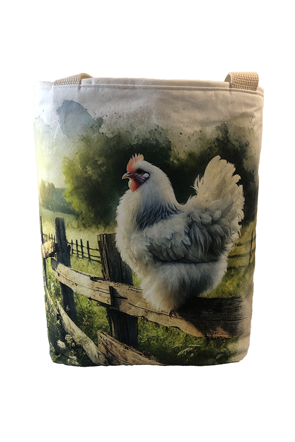 Crafted meticulously, this Handmade Designer Cochin White Fence tote bag showcases a picture of a majestic show chicken, capturing its elegance and vibrant plumage in stunning detail. The design is printed on an all-cotton outer layer, which is durable and lends a soft, luxurious feel to the bag. The outer fabric is carefully selected to ensure the striking image remains vibrant and eye-catching, making the tote a conversation starter wherever you go.