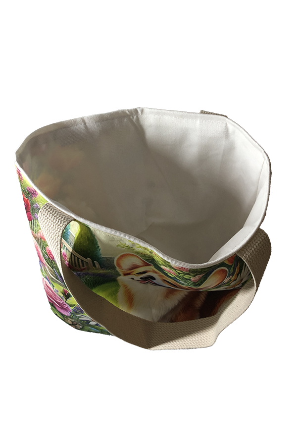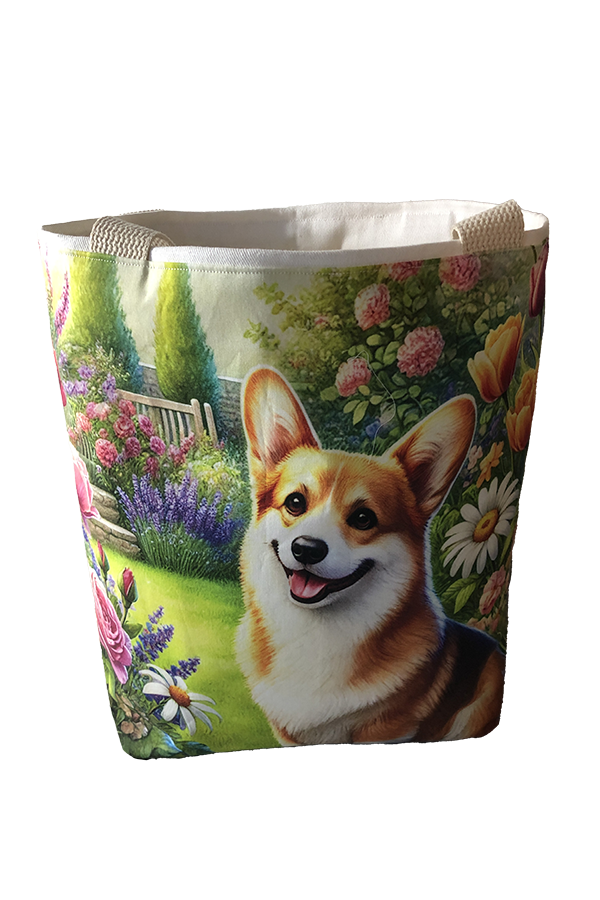 Introducing the epitome of canine elegance and artisan craftsmanship: the Handmade Designer Corgi Flowers Tote Bag. Standing proud at 14 inches tall and stretching 16 inches wide, this exquisite accessory is a tribute to functionality and style. Crafted with meticulous attention to detail, it will become your wardrobe’s darling. At first glance, your eyes are immediately drawn to the captivating design gracing the tote’s exterior. Your pet is displayed in a beautiful scene on a durable fabric. The playful demeanor brings a touch of whimsy to the bag, making it a conversation starter wherever you go.