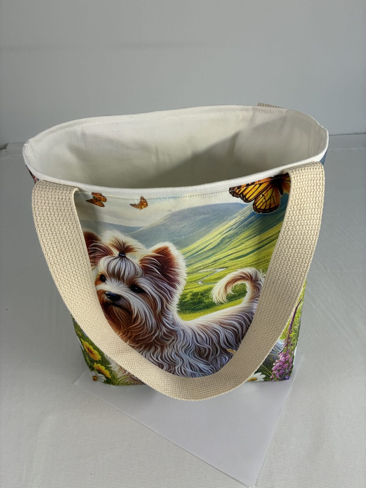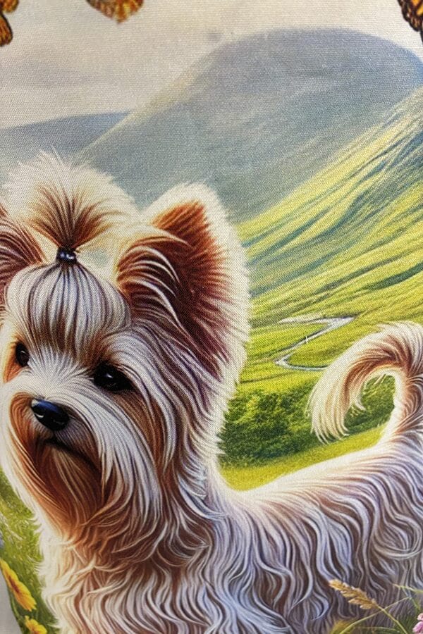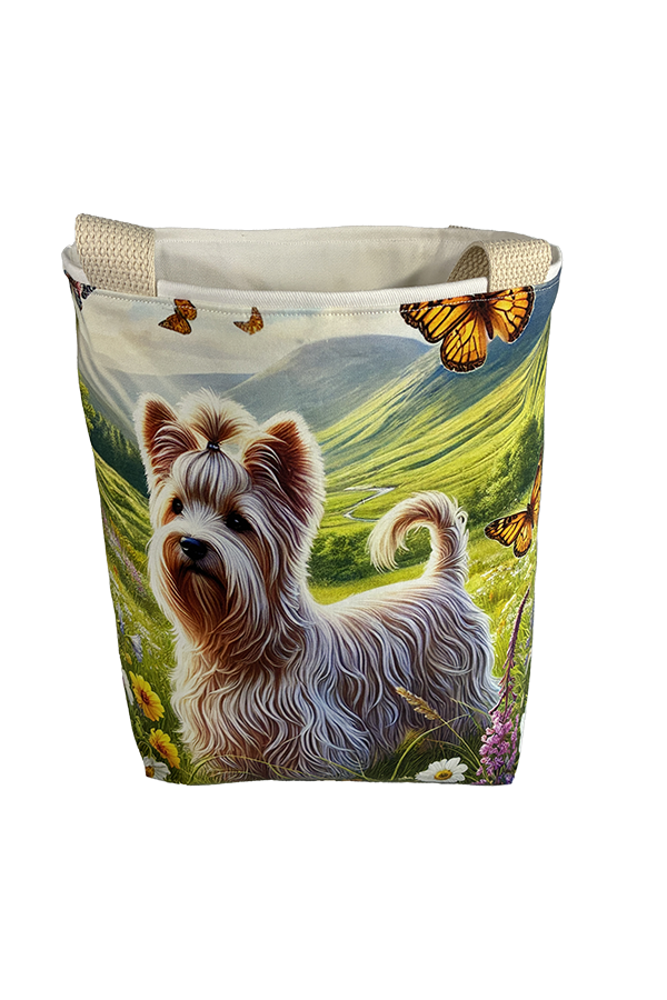 Introducing the epitome of canine elegance and artisan craftsmanship: the Handmade Designer Dandie Dinmont Glen Tote Bag. Standing proud at 14 inches tall and stretching 16 inches wide, this exquisite accessory is a tribute to functionality and style. Crafted with meticulous attention to detail, it will become your wardrobe’s darling. At first glance, your eyes are immediately drawn to the captivating design gracing the tote’s exterior. Your pet is displayed in a beautiful scene with personality and charm. Their playful demeanor brings a touch of whimsy to the bag, making it a conversation starter wherever you go.