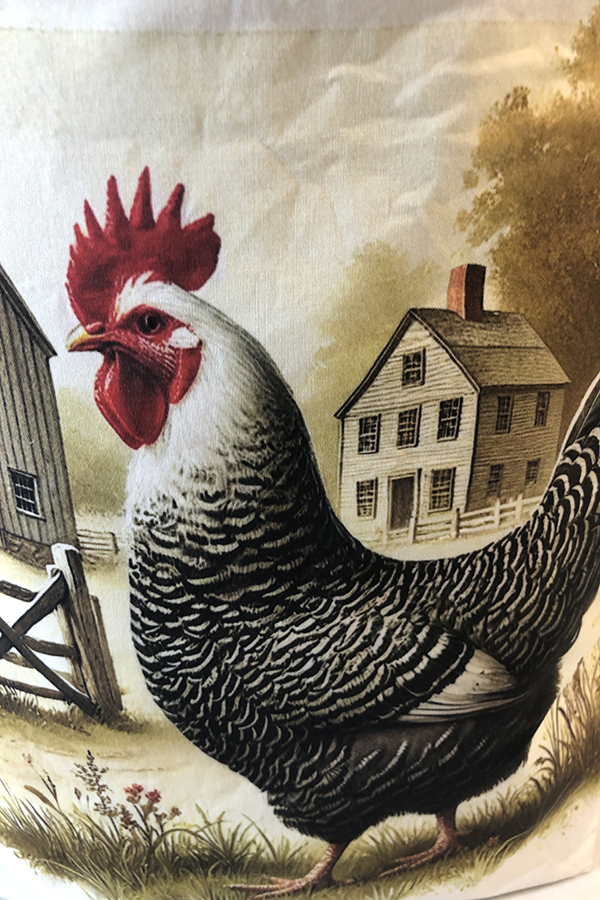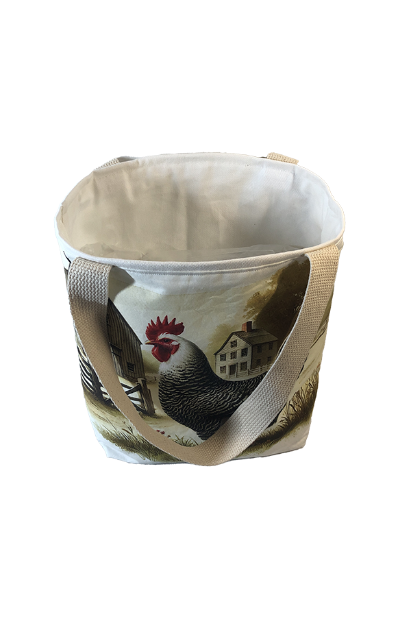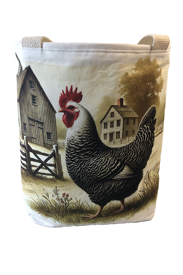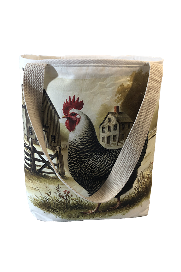 Crafted meticulously, this Handmade Designer Dominique Farm tote bag showcases a picture of a majestic show chicken, capturing its elegance and vibrant plumage in stunning detail. The design is printed on an all-cotton outer layer, which is durable and lends a soft, luxurious feel to the bag. The outer fabric is carefully selected to ensure the striking image remains vibrant and eye-catching, making the tote a conversation starter wherever you go.