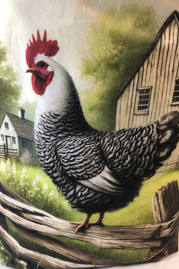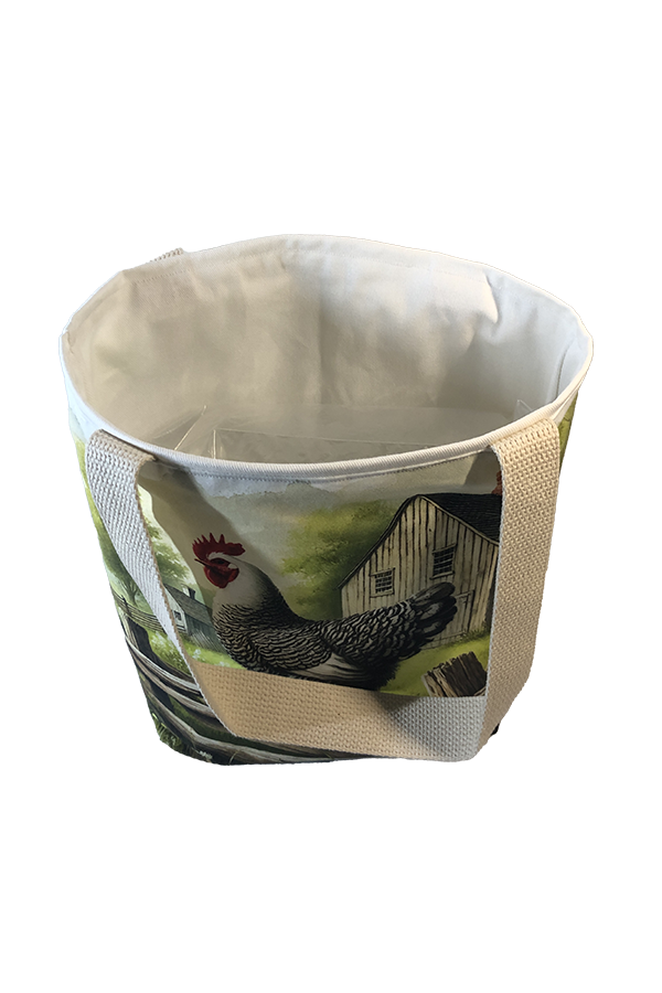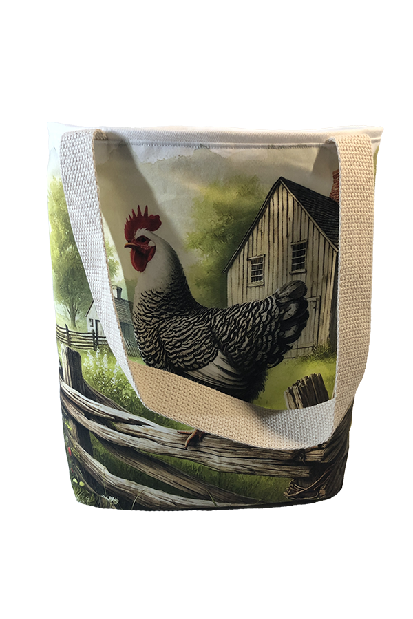 Crafted meticulously, this Handmade Designer Dominique Fence tote bag showcases a picture of a majestic show chicken, capturing its elegance and vibrant plumage in stunning detail. The design is printed on an all-cotton outer layer, which is durable and lends a soft, luxurious feel to the bag. The outer fabric is carefully selected to ensure the striking image remains vibrant and eye-catching, making the tote a conversation starter wherever you go.