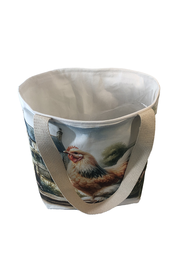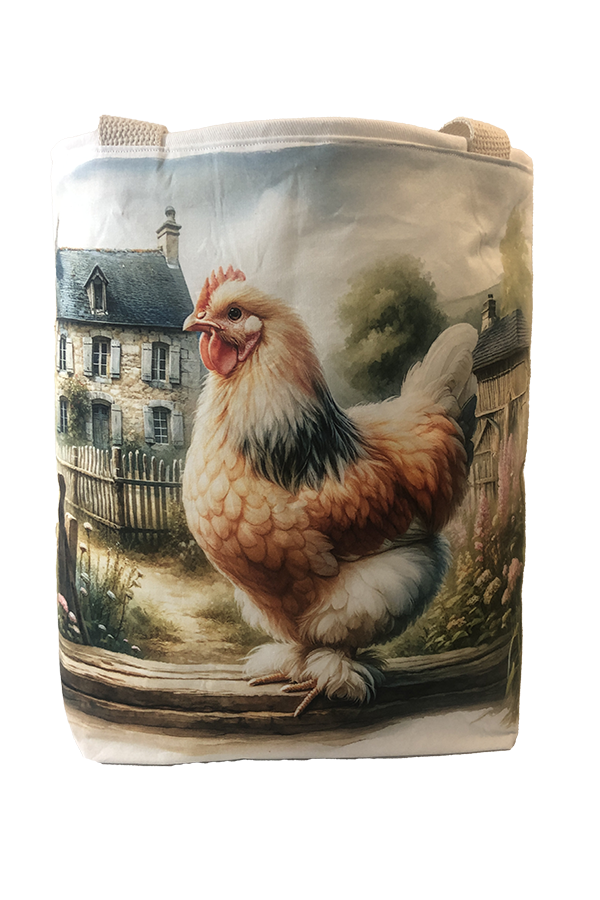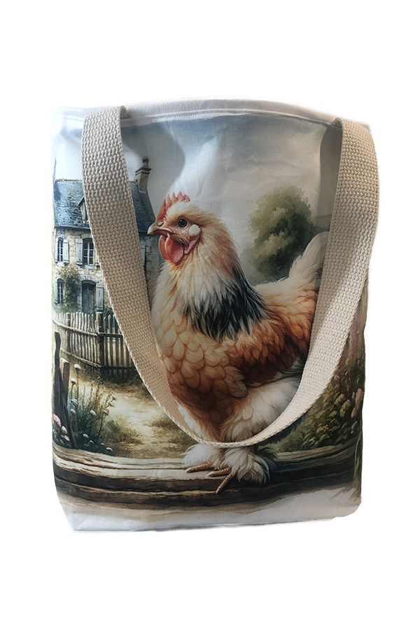 Crafted meticulously, this Handmade Designer Faverolles Salmon Farm tote bag showcases a picture of a majestic show chicken, capturing its elegance and vibrant plumage in stunning detail. The design is printed on an all-cotton outer layer, which is durable and lends a soft, luxurious feel to the bag. The outer fabric is carefully selected to ensure the striking image remains vibrant and eye-catching, making the tote a conversation starter wherever you go.