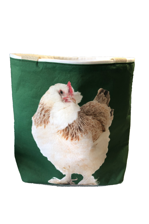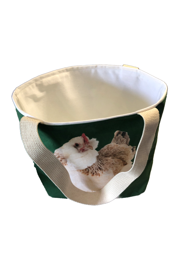 Crafted meticulously, this handmade designer Faverottes #1 Green tote bag showcases a picture of a majestic show chicken, capturing its elegance and vibrant plumage in stunning detail. The design is printed on an all-cotton outer layer, which is durable and lends a soft, luxurious feel to the bag. The outer fabric is carefully selected to ensure the striking image remains vibrant and eye-catching, making the tote a conversation starter wherever you go.