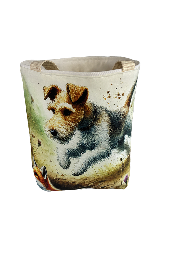 Introducing the epitome of canine elegance and artisan craftsmanship: the Handmade Designer Fox Terrier Fox Tote Bag. Standing proud at 14 inches tall and stretching 16 inches wide, this exquisite accessory is a tribute to functionality and style. Crafted with meticulous attention to detail, it will become your wardrobe’s darling. At first glance, your eyes are immediately drawn to the captivating design gracing the tote’s exterior. Your pet is displayed in a beautiful scene with personality and charm. Their playful demeanor brings a touch of whimsy to the bag, making it a conversation starter wherever you go.