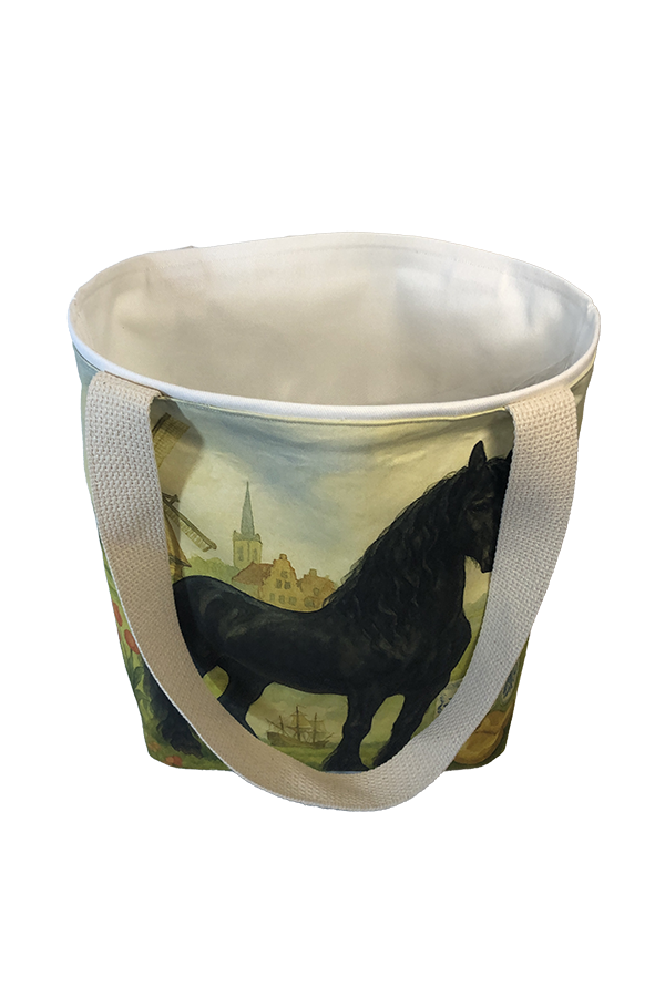 But beauty is not merely skin-deep. This Handmade Designer Friesian Heritage Tote Bag boasts functionality as impressive as its aesthetics. The exterior fabric, carefully chosen for its durability and resilience, ensures that your belongings remain secure and protected during your travels. Meanwhile, the spacious interior, lined with 100 percent cotton white twill, provides a soft and luxurious sanctuary for your essentials. As your fingers trace the bag’s contours, you’ll appreciate the thoughtful details woven into its construction. The one-and-one-half-inch-wide natural cotton strap, meticulously stitched to perfection, offers both comfort and durability, effortlessly accommodating the weight of your belongings while adding a touch of rustic charm to the ensemble.