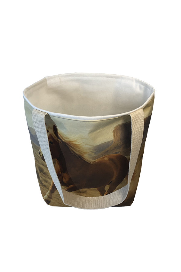But beauty is not merely skin-deep. This Handmade Designer Haflinger Galloping Tote Bag boasts functionality as impressive as its aesthetics. The exterior fabric, carefully chosen for its durability and resilience, ensures that your belongings remain secure and protected during your travels. Meanwhile, the spacious interior, lined with 100 percent cotton white twill, provides a soft and luxurious sanctuary for your essentials. As your fingers trace the bag’s contours, you’ll appreciate the thoughtful details woven into its construction. The one-and-one-half-inch-wide natural cotton strap, meticulously stitched to perfection, offers both comfort and durability, effortlessly accommodating the weight of your belongings while adding a touch of rustic charm to the ensemble.