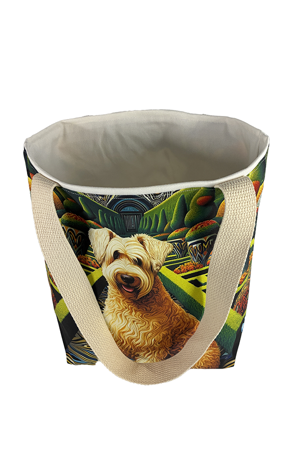 Introducing the epitome of canine elegance and artisan craftsmanship: the Handmade Designer Irish Wheaten OpArt Tote Bag. Standing proud at 14 inches tall and stretching 16 inches wide, this exquisite accessory is a tribute to functionality and style. Crafted with meticulous attention to detail, it will become your wardrobe’s darling. At first glance, your eyes are immediately drawn to the captivating design gracing the tote’s exterior. Your pet is displayed in a beautiful scene with personality and charm. Their playful demeanor brings a touch of whimsy to the bag, making it a conversation starter wherever you go.