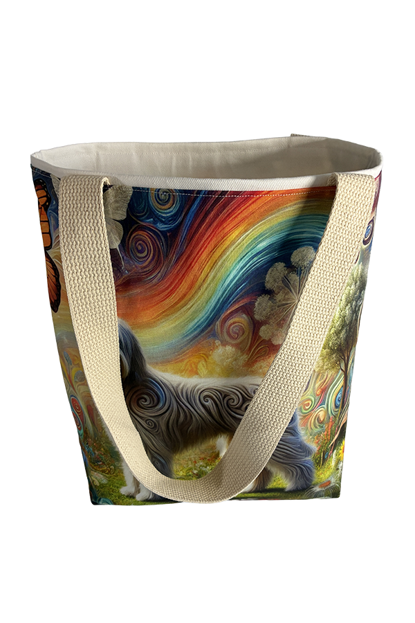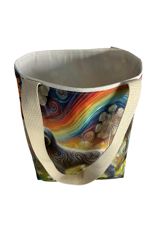 Introducing the epitome of canine elegance and artisan craftsmanship: the Handmade Designer Labradoodle Blond Surreal Tote Bag. Standing proud at 14 inches tall and stretching 16 inches wide, this exquisite accessory is a tribute to functionality and style. Crafted with meticulous attention to detail, it will become your wardrobe’s darling. At first glance, your eyes are immediately drawn to the captivating design gracing the tote’s exterior. Your pet is displayed in a beautiful scene with personality and charm. Their playful demeanor brings a touch of whimsy to the bag, making it a conversation starter wherever you go.