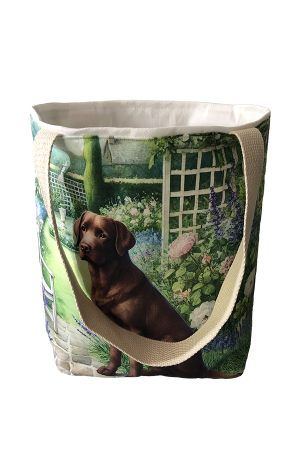 Introducing the epitome of canine elegance and artisan craftsmanship: the Handmade Designer Labrador Chocolate Garden Tote Bag. Standing proud at 14 inches tall and stretching 16 inches wide, this exquisite accessory is a tribute to functionality and style. Crafted with meticulous attention to detail, it will become your wardrobe’s darling. At first glance, your eyes are immediately drawn to the captivating design gracing the tote’s exterior. Your pet is displayed in a beautiful scene on a durable fabric. The playful demeanor brings a touch of whimsy to the bag, making it a conversation starter wherever you go.