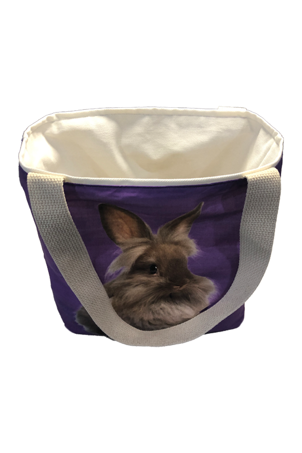 The bag’s exterior is crafted from premium designer cotton fabric, featuring an adorable bunny pattern that captures the essence of springtime charm. The bunnies, depicted in real-life poses, bring a cheerful and nature-inspired aesthetic to the bag. The colors are a harmonious mix of soft pastels and earthy tones, making this Handmade Designer Lionhead #1 Purple Tote Bag both eye-catching and versatile, suitable for pairing with a wide range of outfits.
