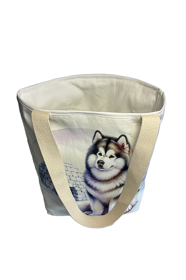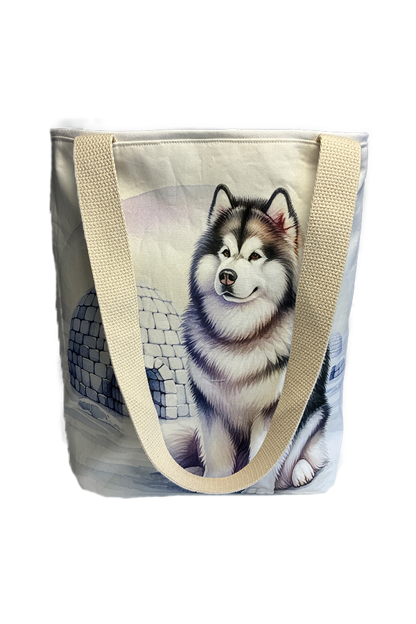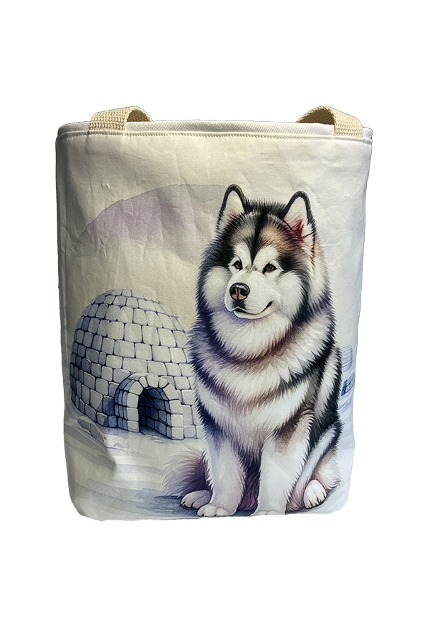 But beauty is not merely skin-deep. This Handmade Designer Malamute Igloo Tote Bag boasts functionality as impressive as its aesthetics. The exterior fabric, carefully selected for its durability and resilience, keeps your belongings secure and protected during your travels.