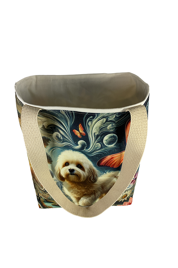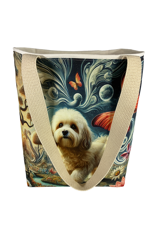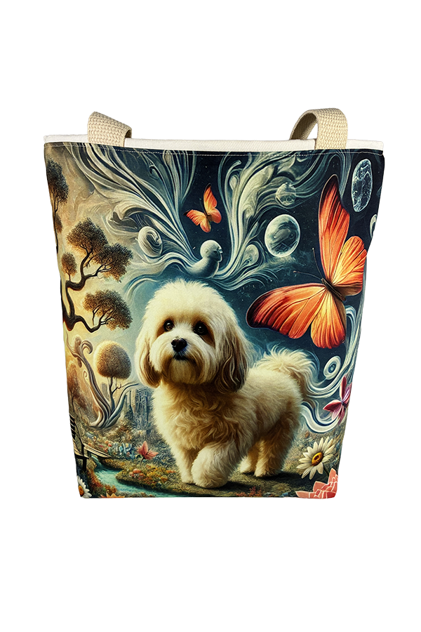 Introducing the epitome of canine elegance and artisan craftsmanship: the Handmade Designer Maltipoo Surrealism Tote Bag. Standing proud at 14 inches tall and stretching 16 inches wide, this exquisite accessory is a tribute to functionality and style. Crafted with meticulous attention to detail, it will become your wardrobe’s darling. At first glance, your eyes are immediately drawn to the captivating design gracing the tote’s exterior. Your pet is displayed in a beautiful scene with personality and charm. Their playful demeanor brings a touch of whimsy to the bag, making it a conversation starter wherever you go.