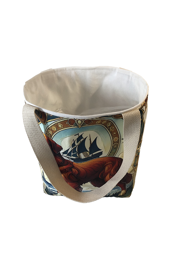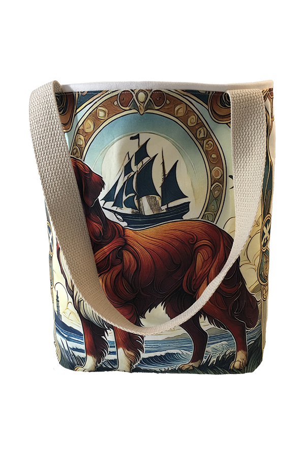 Introducing the epitome of canine elegance and artisan craftsmanship: the Handmade Designer Toller Nouveau Tote Bag. Standing proudly at 14 inches tall and stretching 16 inches wide, this exquisite accessory is a testament to both functionality and style. Crafted with meticulous attention to detail, it will become your wardrobe’s darling. At first glance, your eyes are immediately drawn to the captivating design gracing the tote’s exterior. Your pet is displayed in a beautiful scene on a durable fabric. The playful demeanor brings a touch of whimsy to the bag, making it a conversation starter wherever you go.