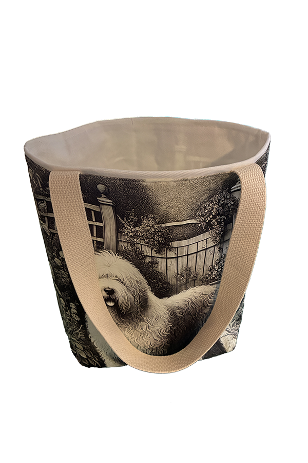 But beauty is not merely skin-deep. This Handmade Designer English Sheepdog Engraving Tote Bag boasts functionality as impressive as its aesthetics. The exterior fabric, carefully chosen for its durability and resilience, ensures that your belongings remain secure and protected during your travels. Meanwhile, the spacious interior, lined with 100 percent cotton white twill, provides a soft and luxurious sanctuary for your essentials. As your fingers trace the bag’s contours, you’ll appreciate the thoughtful details woven into its construction. The one-and-one-half-inch-wide natural cotton strap, meticulously stitched to perfection, offers both comfort and durability, effortlessly accommodating the weight of your belongings while adding a touch of rustic charm to the ensemble.