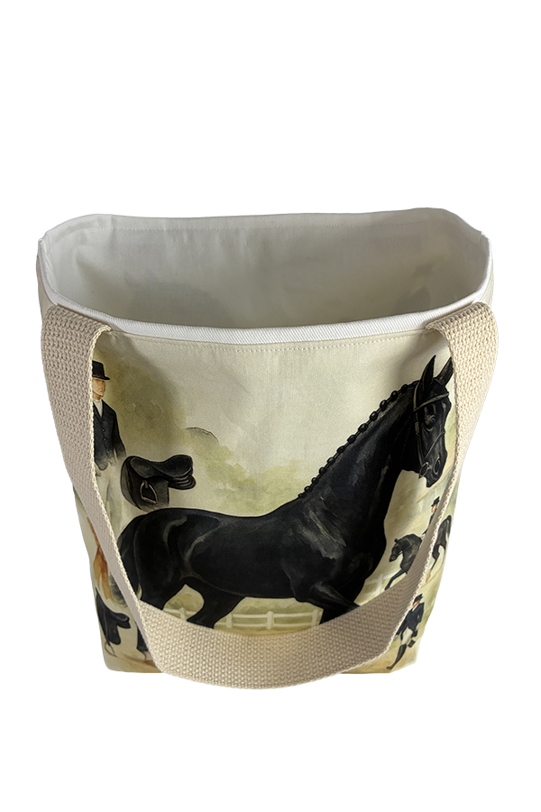 But beauty is not merely skin-deep. This Handmade Designer Oldenburg Black Dressage Tote Bag boasts functionality as impressive as its aesthetics. The exterior fabric, carefully chosen for its durability and resilience, ensures that your belongings remain secure and protected during your travels. Meanwhile, the spacious interior, lined with 100 percent cotton white twill, provides a soft and luxurious sanctuary for your essentials. As your fingers trace the bag’s contours, you’ll appreciate the thoughtful details woven into its construction. The one-and-one-half-inch-wide natural cotton strap, meticulously stitched to perfection, offers both comfort and durability, effortlessly accommodating the weight of your belongings while adding a touch of rustic charm to the ensemble.