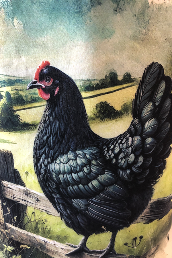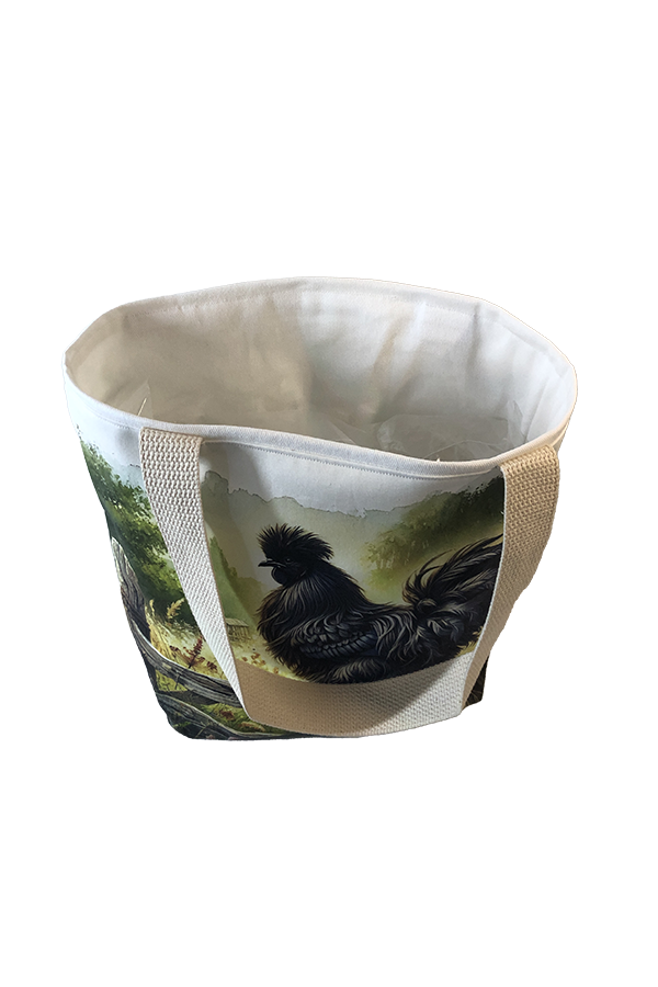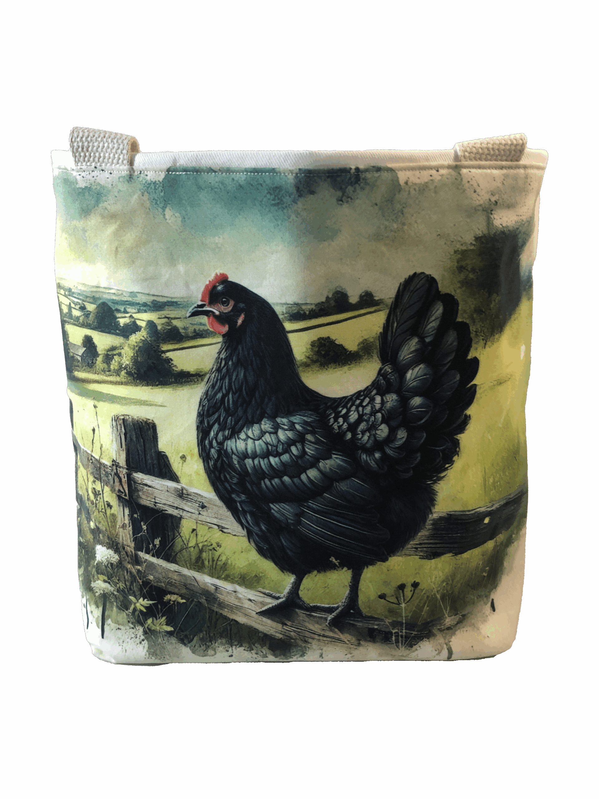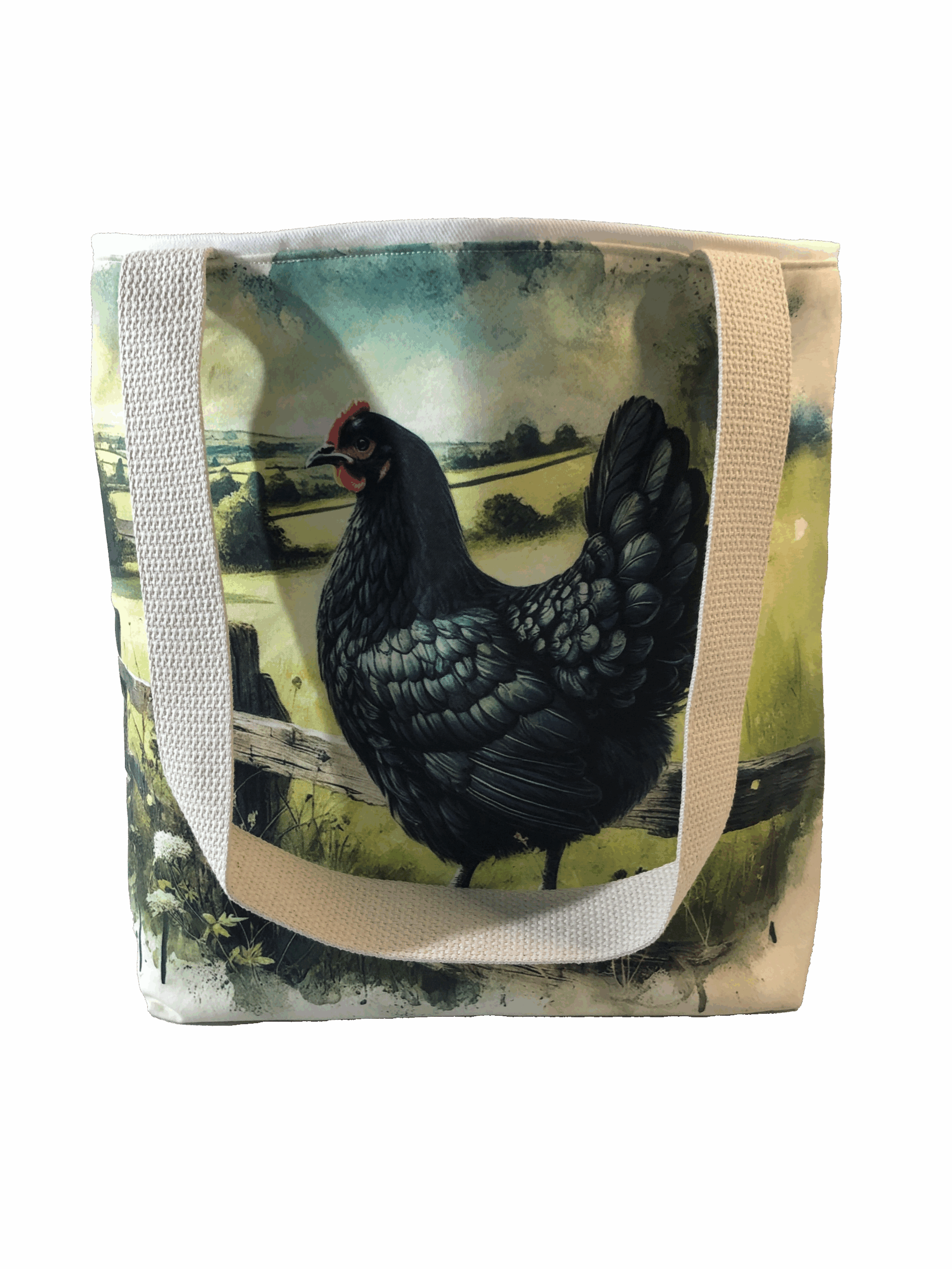 Crafted meticulously, this Handmade Designer Orpington Black Fence tote bag showcases a picture of a majestic show chicken, capturing its elegance and vibrant plumage in stunning detail. The design is printed on an all-cotton outer layer, which is durable and lends a soft, luxurious feel to the bag. The outer fabric is carefully selected to ensure the striking image remains vibrant and eye-catching, making the tote a conversation starter wherever you go.