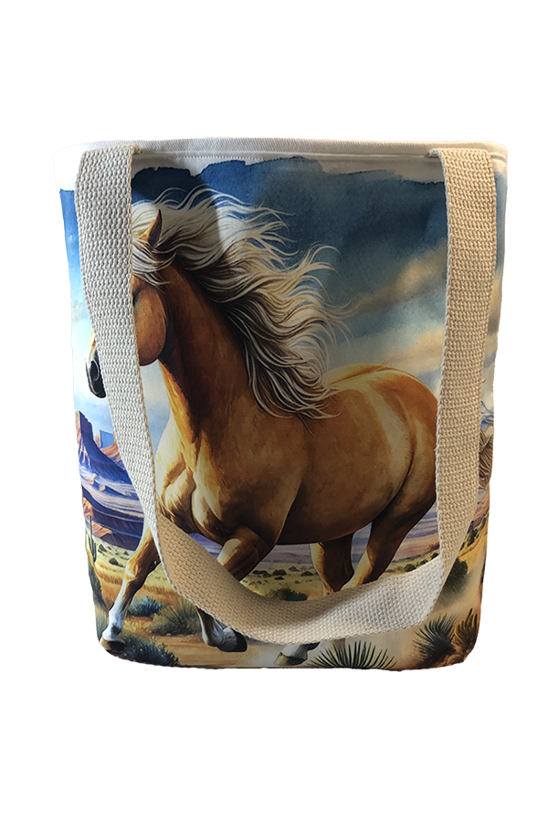 Introducing the epitome of equine elegance and artisan craftsmanship: the Handmade Designer Palomino Galloping Tote Bag. Standing proud at 14 inches tall and stretching 16 inches wide, this exquisite accessory is a tribute to functionality and style. Crafted with meticulous attention to detail, it will become your wardrobe’s darling. At first glance, your eyes are immediately drawn to the captivating design gracing the tote’s exterior. Adorning the durable fabric are elegant horse graphics, each infused with personality and charm. Their stately demeanor brings a touch of whimsy to the bag, making it a conversation starter wherever you go.