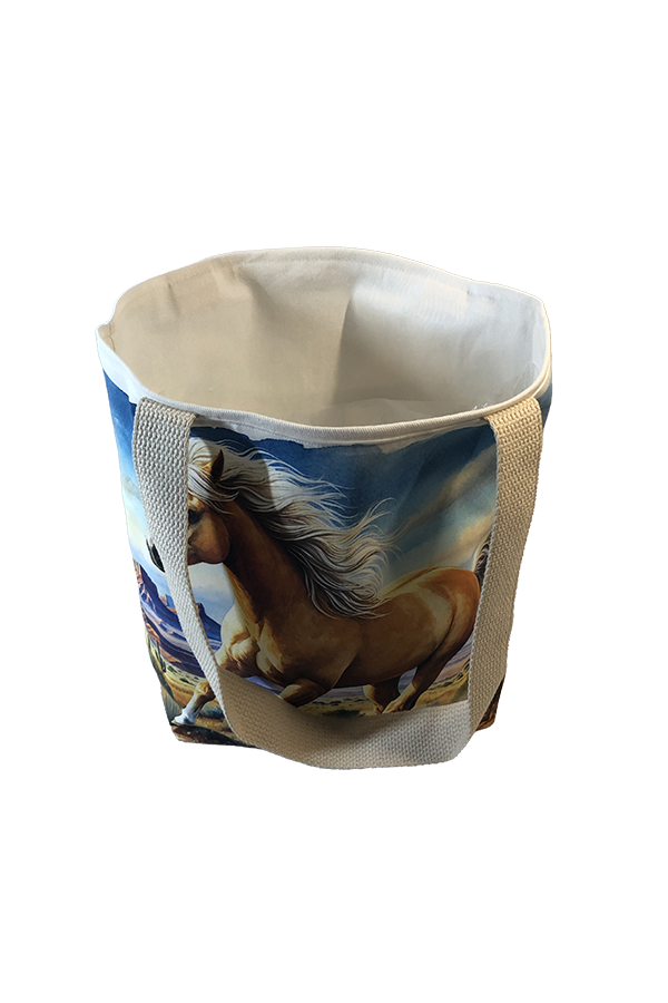But beauty is not merely skin-deep. This Handmade Designer Palomino Galloping Tote Bag boasts functionality as impressive as its aesthetics. The exterior fabric, carefully chosen for its durability and resilience, ensures that your belongings remain secure and protected during your travels. Meanwhile, the spacious interior, lined with 100 percent cotton white twill, provides a soft and luxurious sanctuary for your essentials. As your fingers trace the bag’s contours, you’ll appreciate the thoughtful details woven into its construction. The one-and-one-half-inch-wide natural cotton strap, meticulously stitched to perfection, offers both comfort and durability, effortlessly accommodating the weight of your belongings while adding a touch of rustic charm to the ensemble.