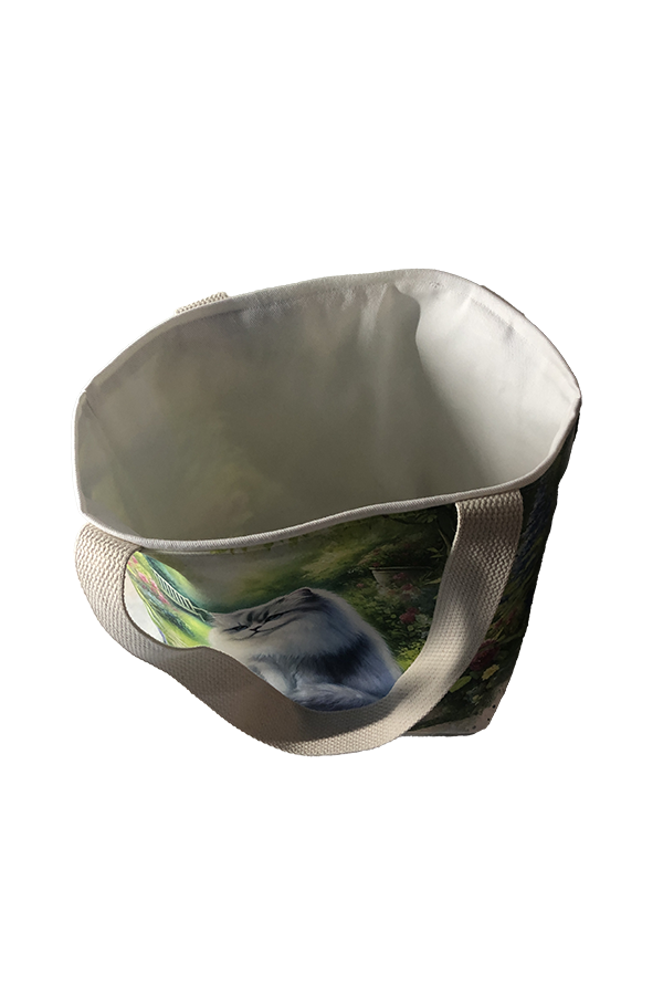 The fabric showcases the beauty of your pet in a relaxed pose, artfully rendered to capture the unique personalities of our beloved feline friends. The print’s vibrant colors and intricate details make this tote a standout accessory, sure to turn heads wherever you go. The interior of This Handmade Designer Persian Cat Garden Tote Bag is lined with heavy cotton twill, providing a robust and durable foundation that maintains the bag’s shape and integrity. This high-quality lining not only adds to the bag’s durability but also offers a soft, luxurious feel, ensuring your belongings are well-protected.