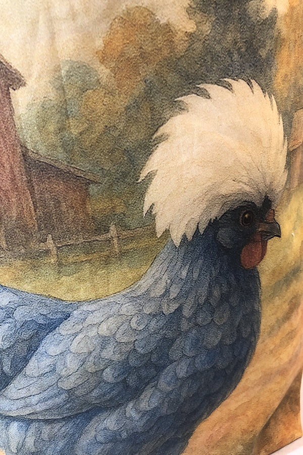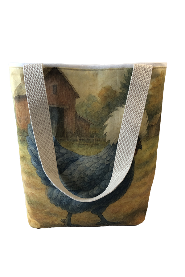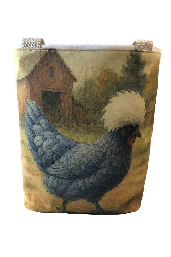 Crafted meticulously, this Handmade Designer Polish Blue Lace tote bag showcases a picture of a majestic show chicken, capturing its elegance and vibrant plumage in stunning detail. The design is printed on an all-cotton outer layer, which is durable and lends a soft, luxurious feel to the bag. The outer fabric is carefully selected to ensure the striking image remains vibrant and eye-catching, making the tote a conversation starter wherever you go.