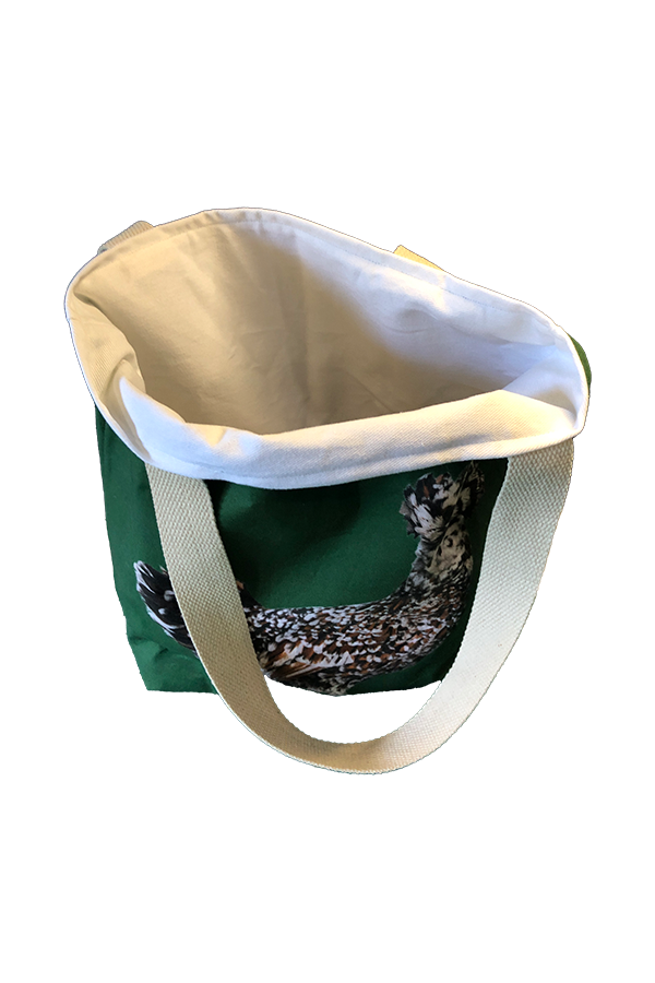 Inside, the handmade designer  Polish Chicken #1 tote features a heavy cotton twill inner layer, providing additional strength and resilience. This sturdy material ensures that the bag can handle your daily essentials with ease, from books and groceries to gym gear and beach towels. The inner layer is designed to withstand wear and tear, so you can rely on this tote for years to come.
