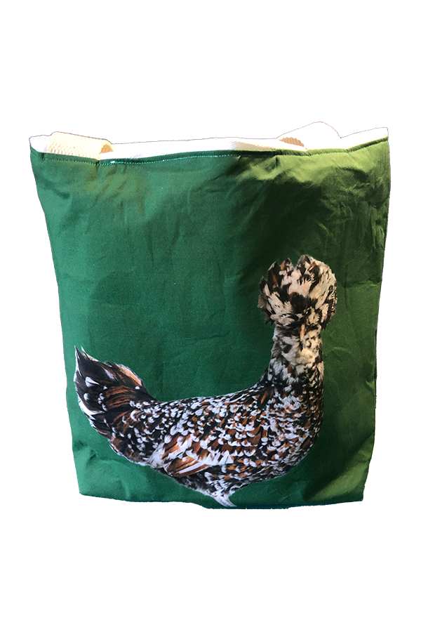 Crafted meticulously, this handmade designer Polish Chicken #1 tote bag showcases a picture of a majestic show chicken, capturing its elegance and vibrant plumage in stunning detail. The design is printed on an all-cotton outer layer, which is durable and lends a soft, luxurious feel to the bag. The outer fabric is carefully selected to ensure the striking image remains vibrant and eye-catching, making the tote a conversation starter wherever you go.