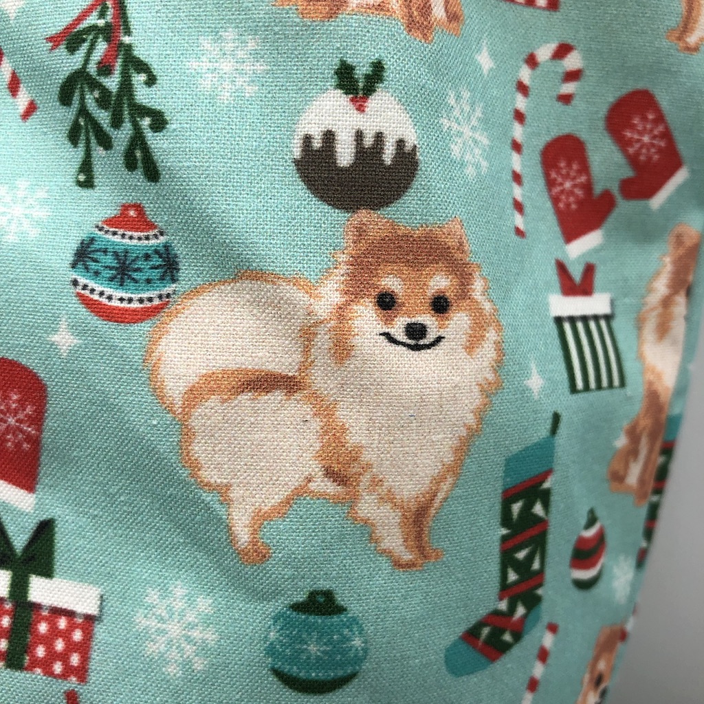 This Pomeranian #1 Christmas stocking is made with Pomeranian-themed designer fabric and lined with soft anti-pill fleece. All Christmas stockings are handmade by me in my studio. Another product complimenting this Pomeranian #1 Christmas stocking is the Pomeranian #3 Tote Bag.  If you would like, Click here to visit my Etsy site.