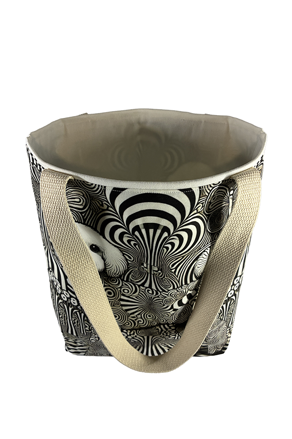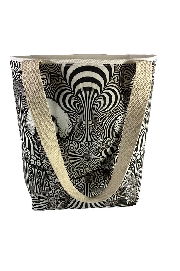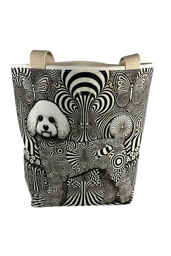 Introducing the epitome of canine elegance and artisan craftsmanship: the Handmade Designer Poochon OpArt Tote Bag. Standing proud at 14 inches tall and stretching 16 inches wide, this exquisite accessory is a tribute to functionality and style. Crafted with meticulous attention to detail, it will become your wardrobe’s darling. At first glance, your eyes are immediately drawn to the captivating design gracing the tote’s exterior. Your pet is displayed in a beautiful scene with personality and charm. Their playful demeanor brings a touch of whimsy to the bag, making it a conversation starter wherever you go.