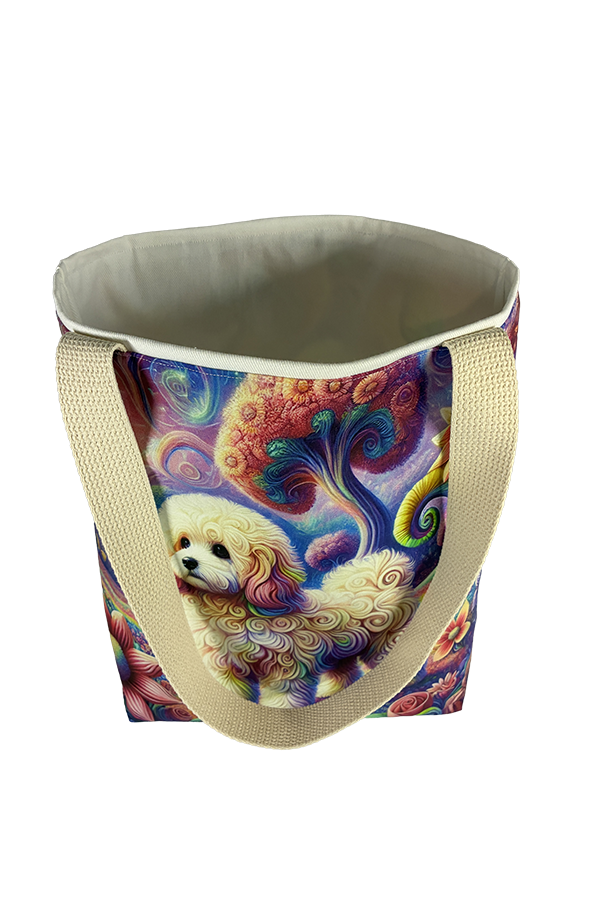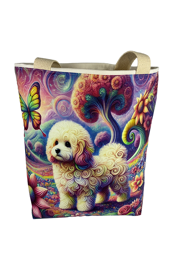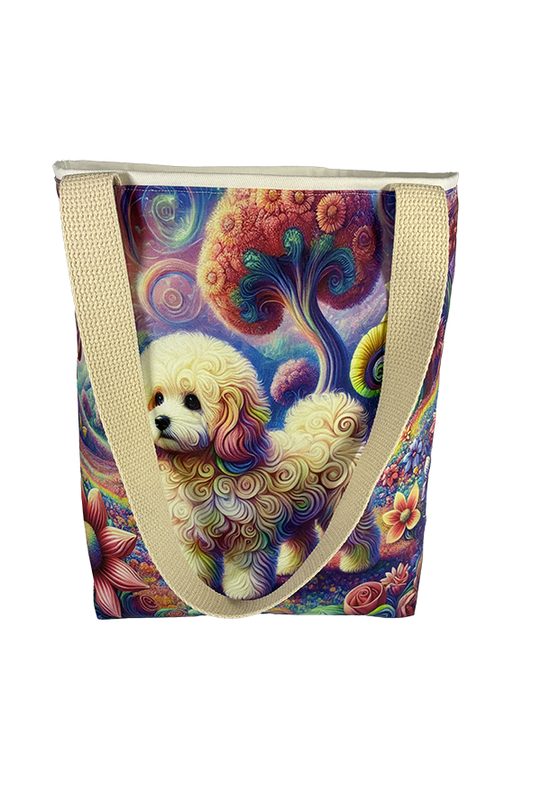 Introducing the epitome of canine elegance and artisan craftsmanship: the Handmade Designer Poochon Surrealism Tote Bag. Standing proud at 14 inches tall and stretching 16 inches wide, this exquisite accessory is a tribute to functionality and style. Crafted with meticulous attention to detail, it will become your wardrobe’s darling. At first glance, your eyes are immediately drawn to the captivating design gracing the tote’s exterior. Your pet is displayed in a beautiful scene with personality and charm. Their playful demeanor brings a touch of whimsy to the bag, making it a conversation starter wherever you go.