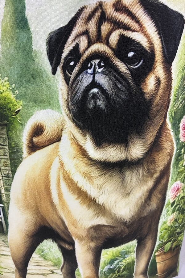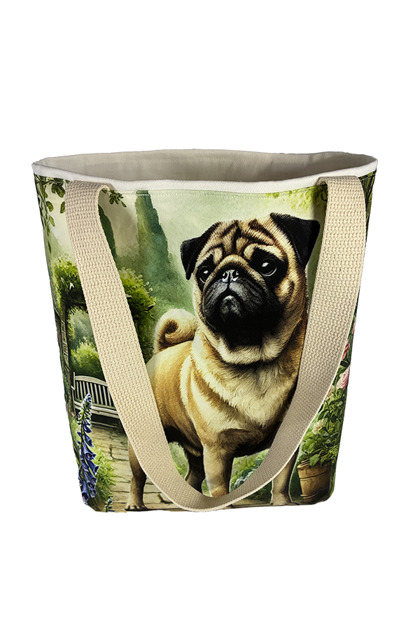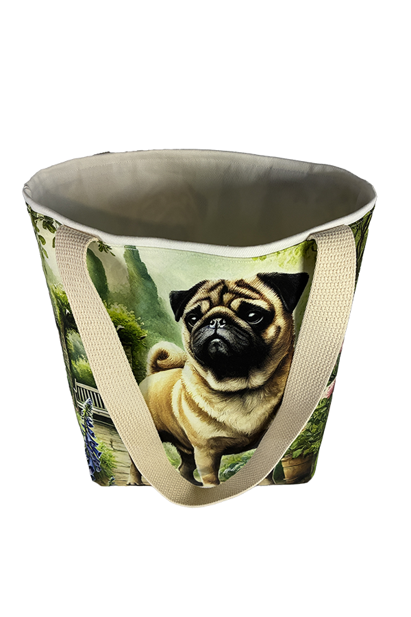 Introducing the epitome of canine elegance and artisan craftsmanship: the Handmade Designer Pug Garden Tote Bag. Standing proud at 14 inches tall and stretching 16 inches wide, this exquisite accessory is a tribute to functionality and style. Crafted with meticulous attention to detail, it will become your wardrobe’s darling. At first glance, your eyes are immediately drawn to the captivating design gracing the tote’s exterior. Your pet is displayed in a beautiful scene with personality and charm. Their playful demeanor brings a touch of whimsy to the bag, making it a conversation starter wherever you go.