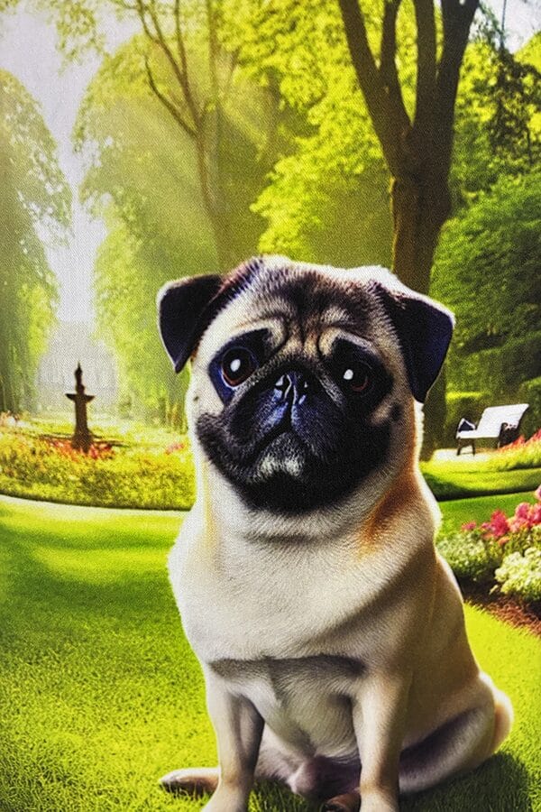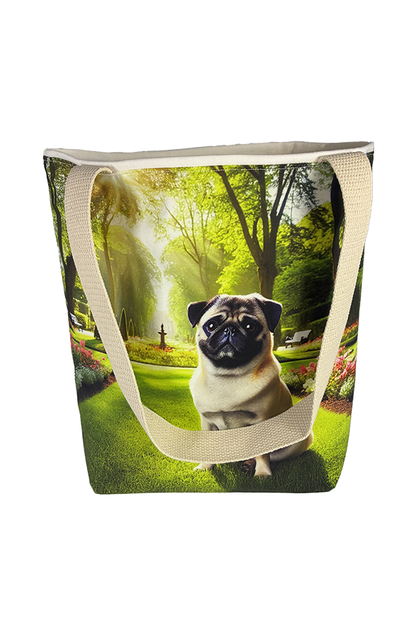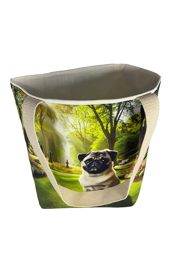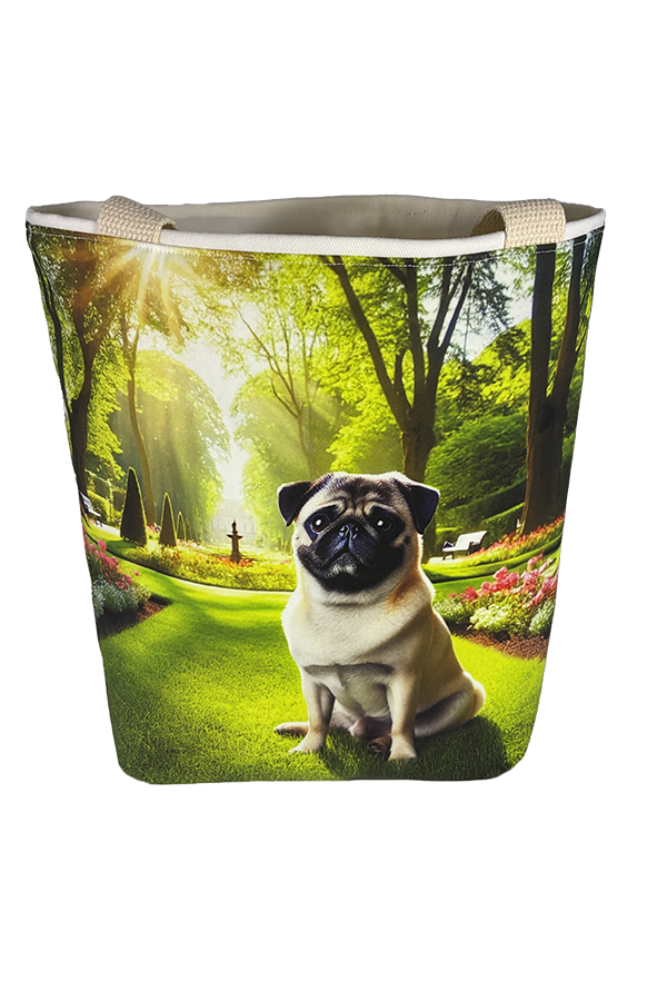 Introducing the epitome of canine elegance and artisan craftsmanship: the Handmade Designer Pug Park Tote Bag. Standing proud at 14 inches tall and stretching 16 inches wide, this exquisite accessory is a tribute to functionality and style. Crafted with meticulous attention to detail, it will become your wardrobe’s darling. At first glance, your eyes are immediately drawn to the captivating design gracing the tote’s exterior. Your pet is displayed in a beautiful scene with personality and charm. Their playful demeanor brings a touch of whimsy to the bag, making it a conversation starter wherever you go.