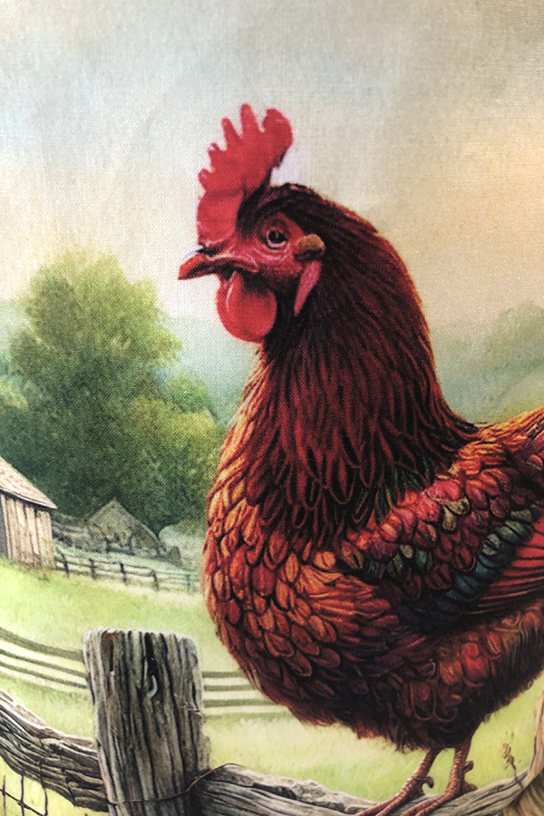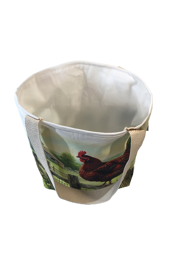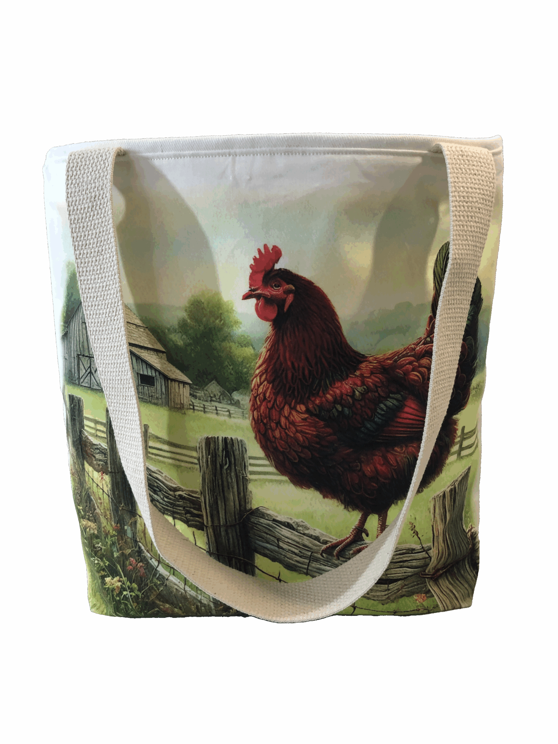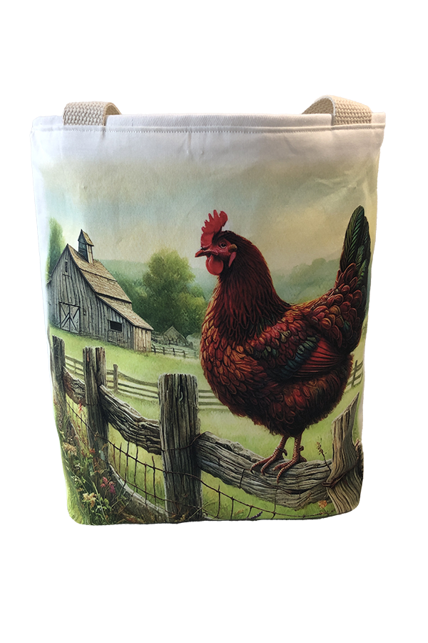 Crafted meticulously, this Handmade Designer RI Red Fence tote bag showcases a picture of a majestic show chicken, capturing its elegance and vibrant plumage in stunning detail. The design is printed on an all-cotton outer layer, which is durable and lends a soft, luxurious feel to the bag. The outer fabric is carefully selected to ensure the striking image remains vibrant and eye-catching, making the tote a conversation starter wherever you go.
