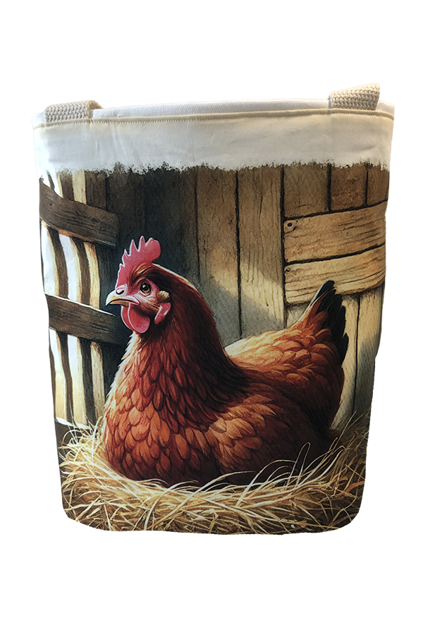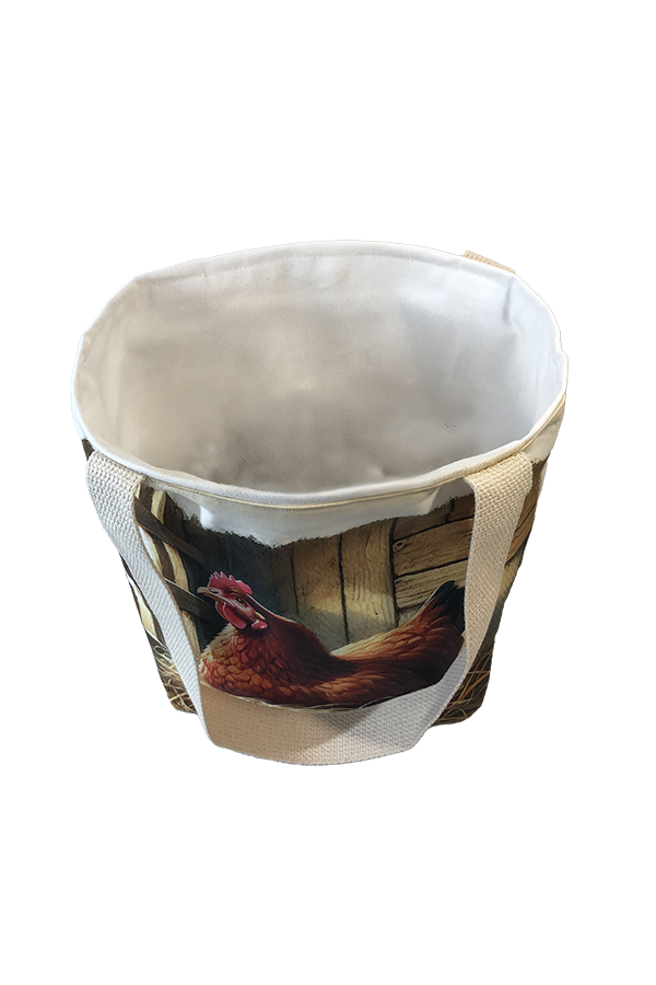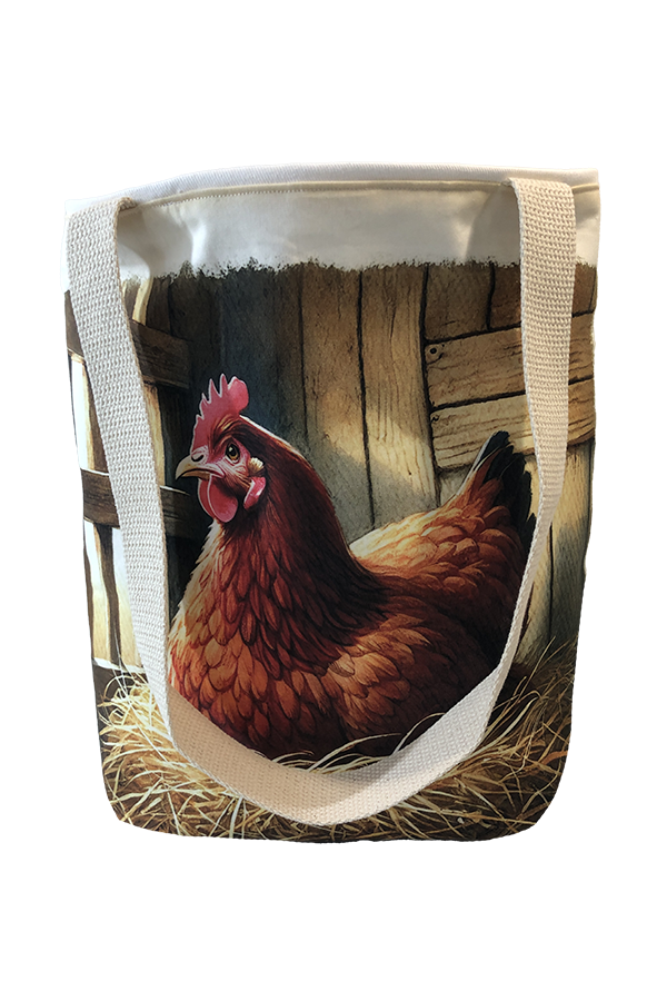 Crafted meticulously, this Handmade Designer RI Red Nest tote bag showcases a picture of a majestic show chicken, capturing its elegance and vibrant plumage in stunning detail. The design is printed on an all-cotton outer layer, which is durable and lends a soft, luxurious feel to the bag. The outer fabric is carefully selected to ensure the striking image remains vibrant and eye-catching, making the tote a conversation starter wherever you go.