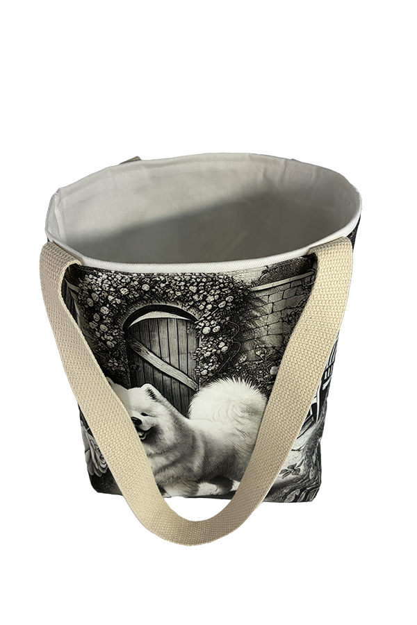 Introducing the epitome of canine elegance and artisan craftsmanship: the Handmade Designer Samoyed Engraving Tote Bag. Standing proud at 14 inches tall and stretching 16 inches wide, this exquisite accessory is a tribute to functionality and style. Crafted with meticulous attention to detail, it will become your wardrobe’s darling. At first glance, your eyes are immediately drawn to the captivating design gracing the tote’s exterior. Your pet is displayed in a beautiful scene with personality and charm. Their playful demeanor brings a touch of whimsy to the bag, making it a conversation starter wherever you go.