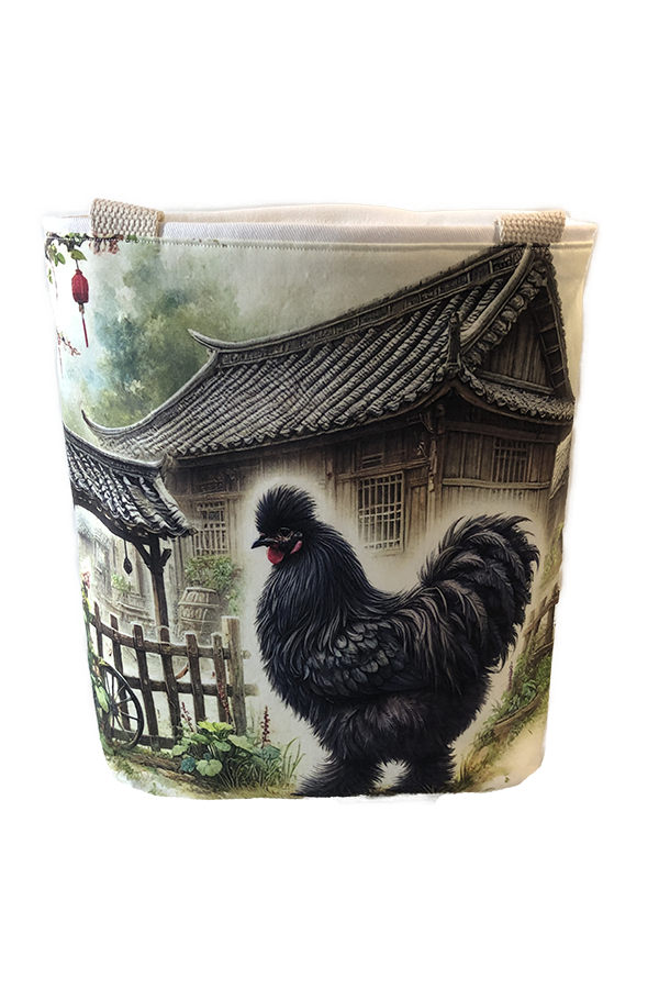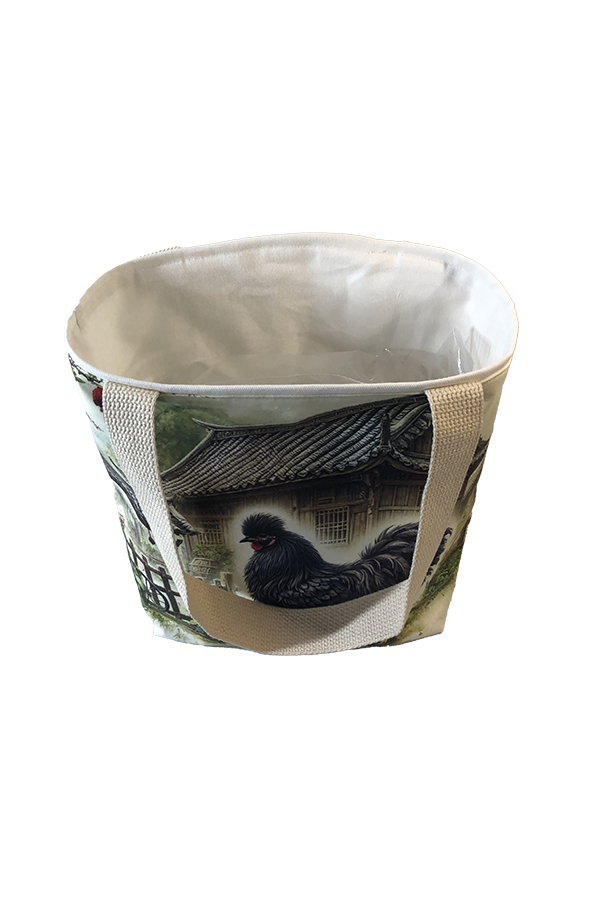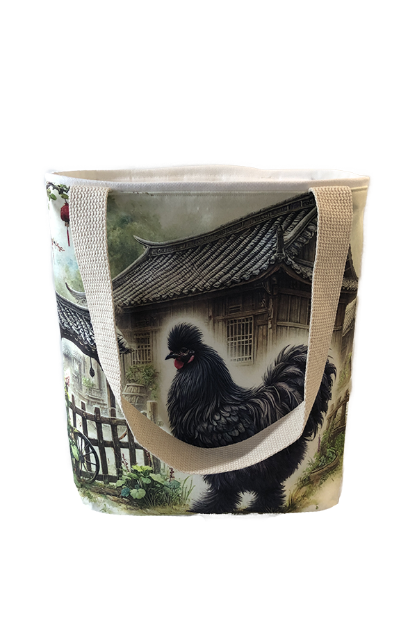 Crafted meticulously, this Handmade Designer Silkie Black Farm tote bag showcases a picture of a majestic show chicken, capturing its elegance and vibrant plumage in stunning detail. The design is printed on an all-cotton outer layer, which is durable and lends a soft, luxurious feel to the bag. The outer fabric is carefully selected to ensure the striking image remains vibrant and eye-catching, making the tote a conversation starter wherever you go.
