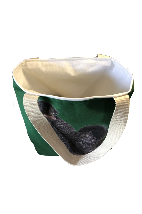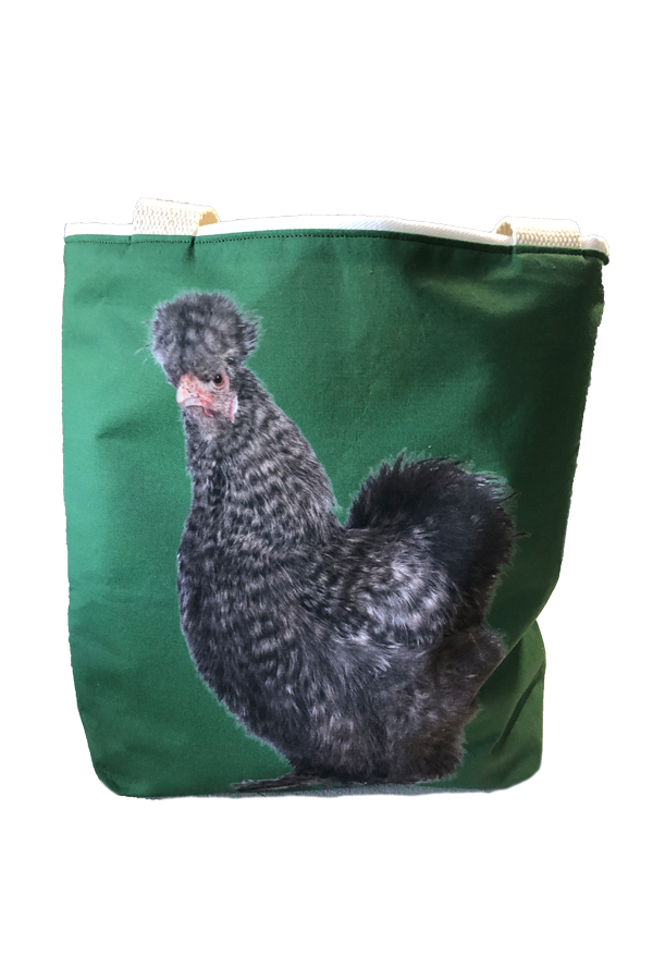 Crafted meticulously, this handmade designer Silkie #4 Green tote bag showcases a picture of a majestic show chicken, capturing its elegance and vibrant plumage in stunning detail. The design is printed on an all-cotton outer layer, which is durable and lends a soft, luxurious feel to the bag. The outer fabric is carefully selected to ensure the striking image remains vibrant and eye-catching, making the tote a conversation starter wherever you go.